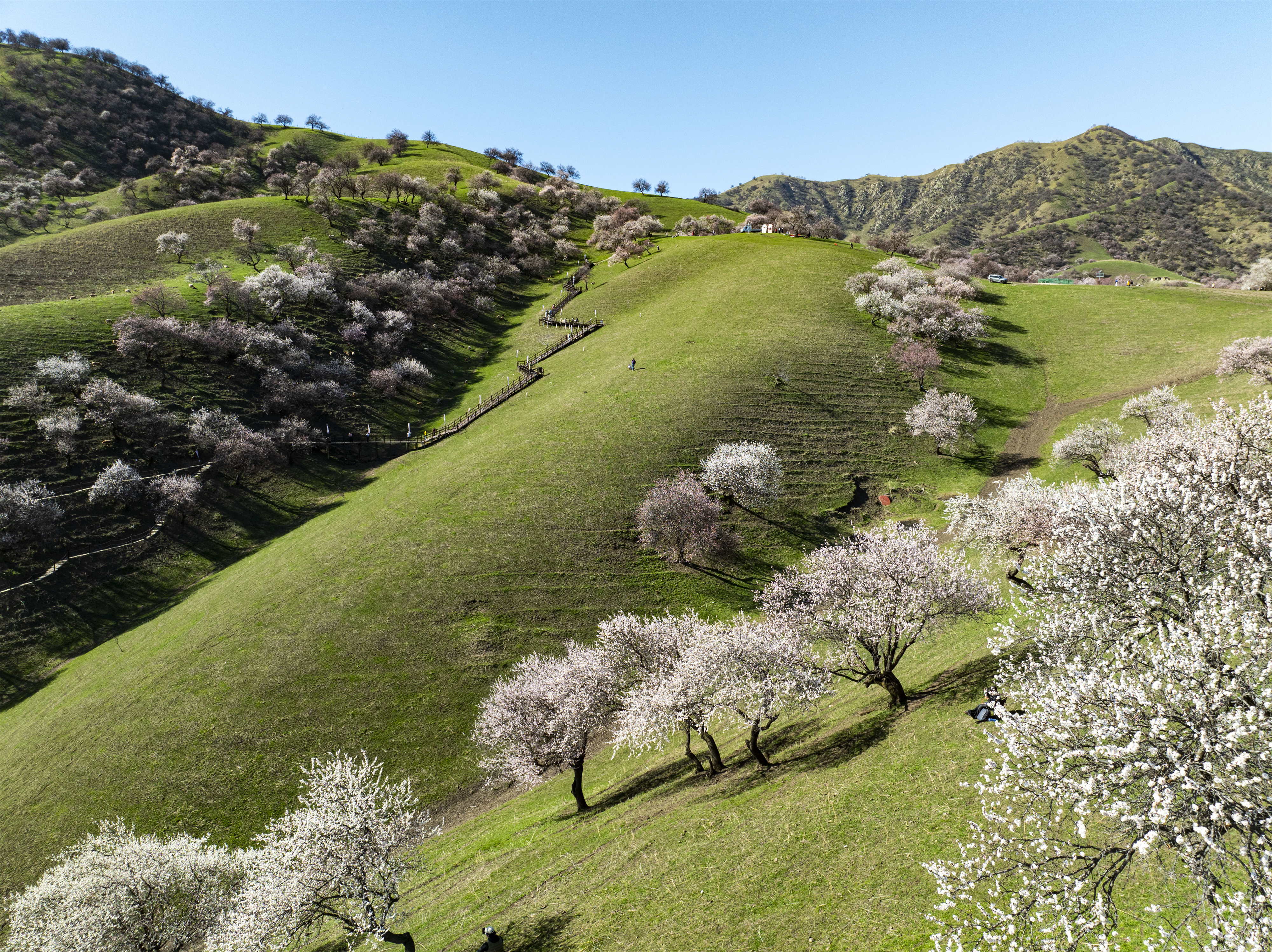 3月31日,新源县那拉提杏花谷迎来野杏花盛放期,漫山遍野的野杏花次第开放,粉白相间的花海铺满山谷,勾勒出一幅绝美的春日田园画卷,吸引各地游客前来踏青赏花。