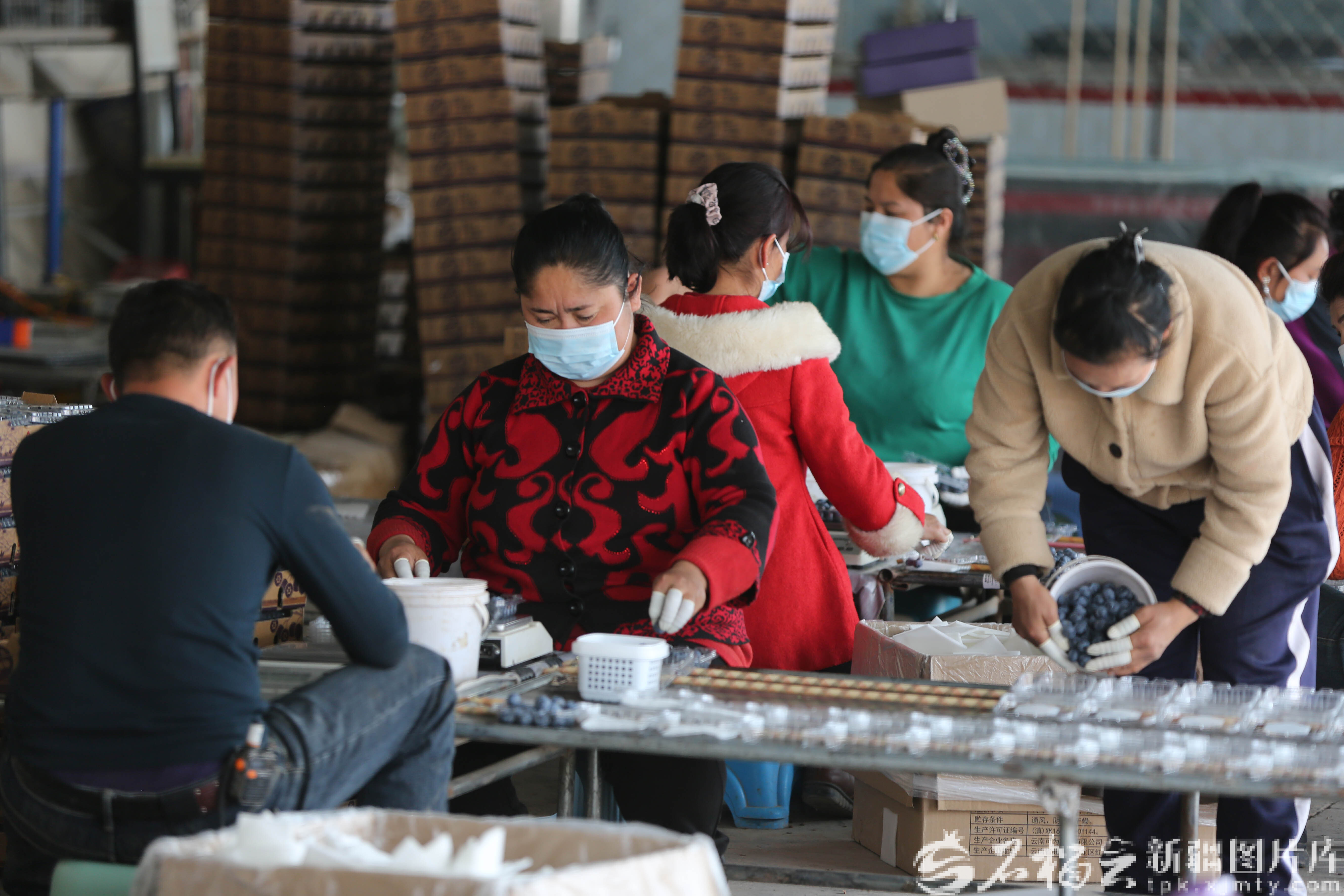 4月1日,伽师县铁日木乡仓村蓝莓基地员工在分装蓝莓。