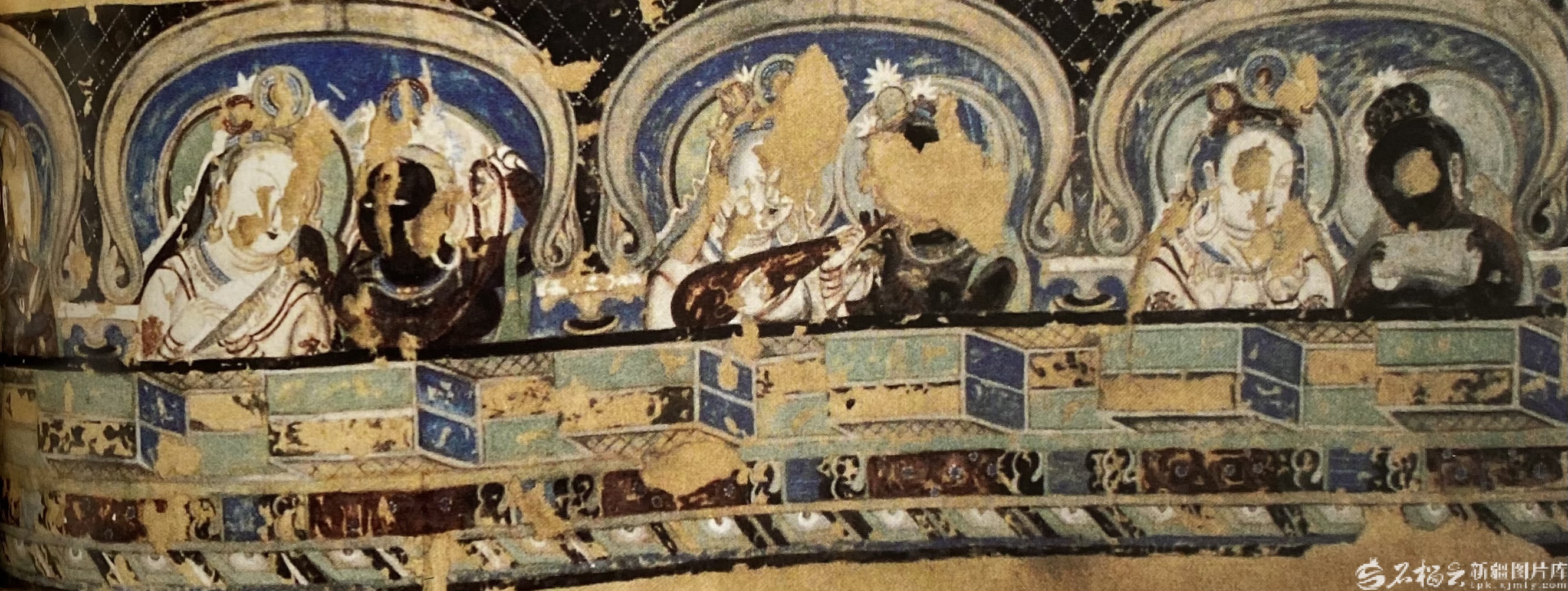 在克孜尔石窟的第38窟,主室左右两壁上部,各绘一列天宫伎乐图,该图为两人一组。有的手持琵琶,指尖按弦;有的吹奏排箫,气韵悠长;有的双手合十,姿态端庄;有的凌空起舞,衣带飘飘。在龟兹壁画里,二人相伴而舞,或一舞一乐的画面甚为多见。一千多年前的画师,用细腻的笔触,将一场丝绸之路的乐舞盛会定格在石窟壁画里。