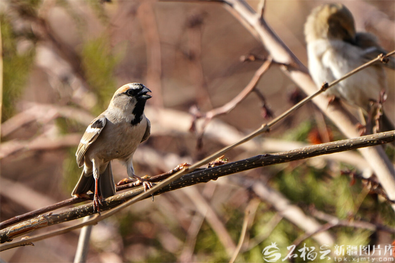 4月2日,一只黑顶麻雀栖息在树枝上。