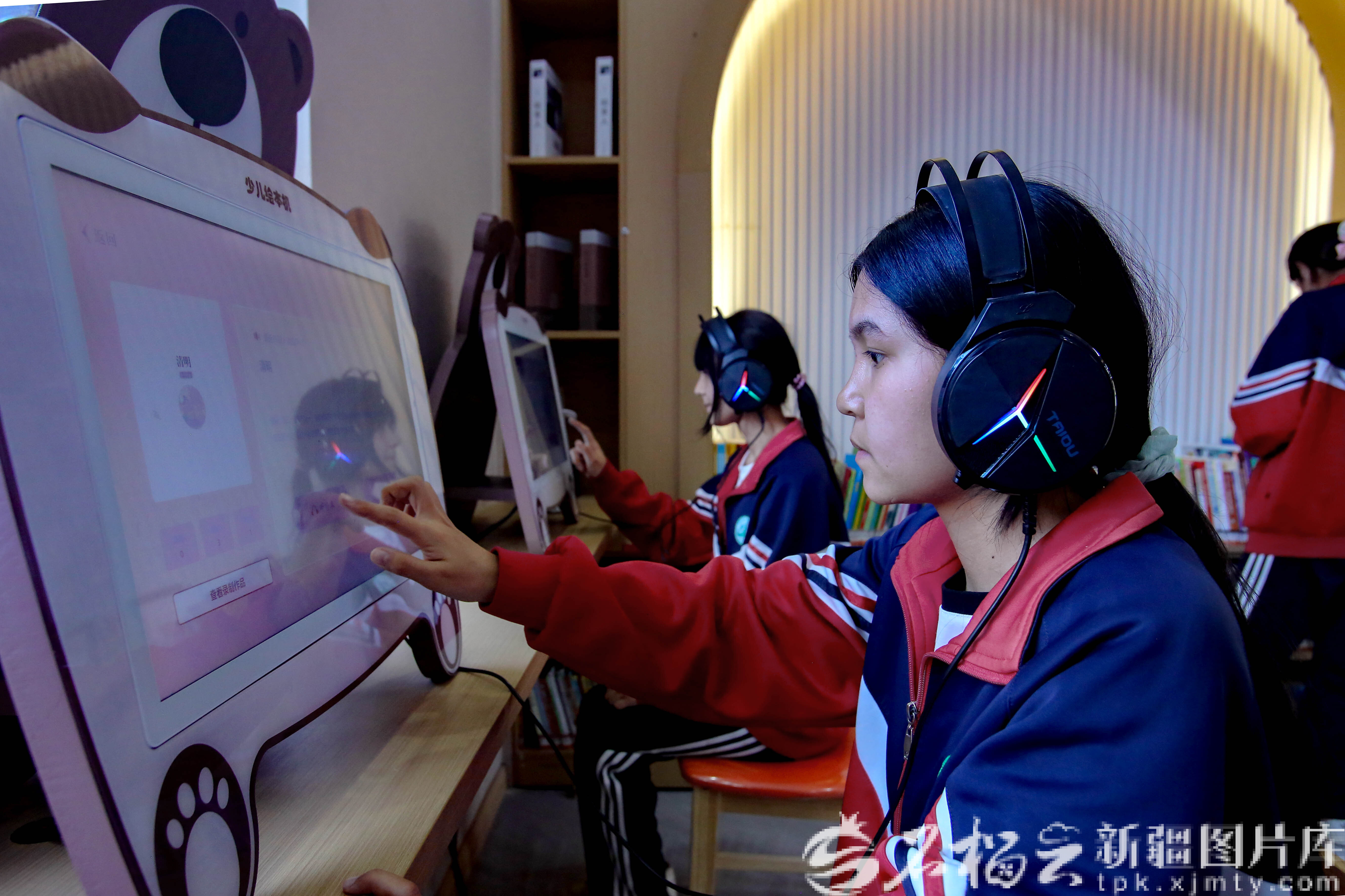 4月1日,学生在位于伽师县巴仁镇平安路的“悦读粤有趣”城市书吧沉浸于有声图书。