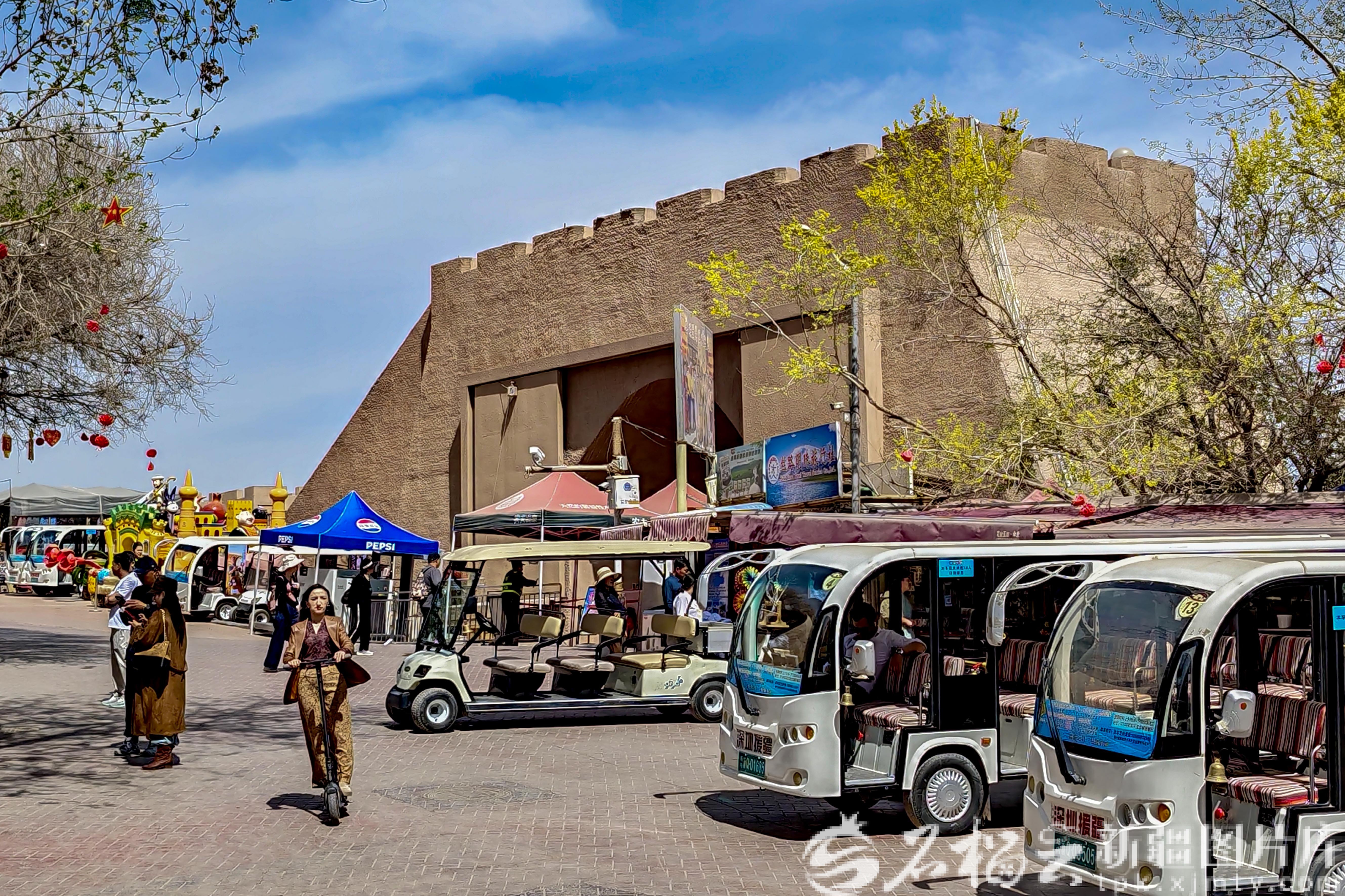 4月2日,喀什古城景区入口,旅游观光车整齐排列。