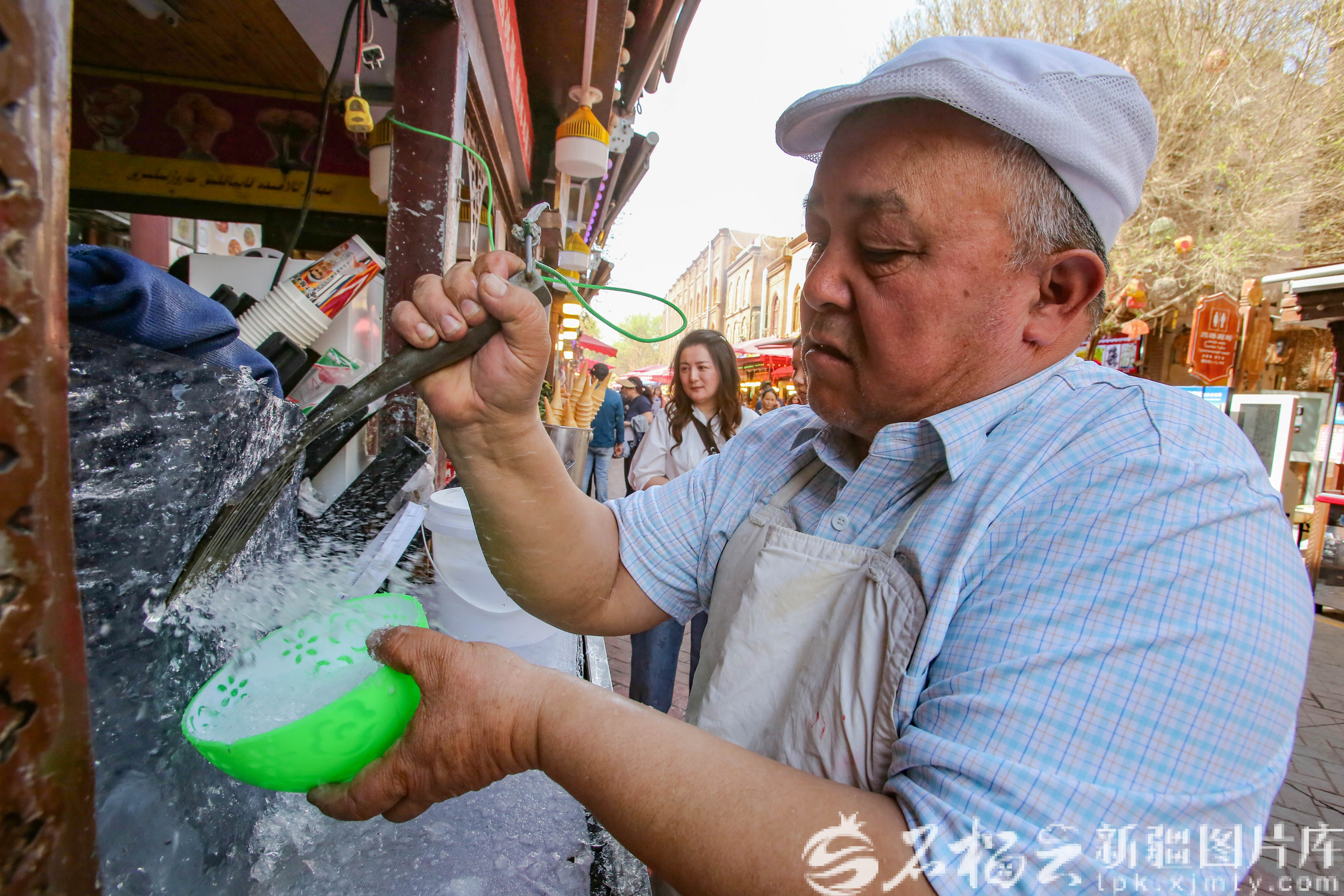4月2日,喀什古城景区汗巴扎一摊主在制作刨冰酸奶。