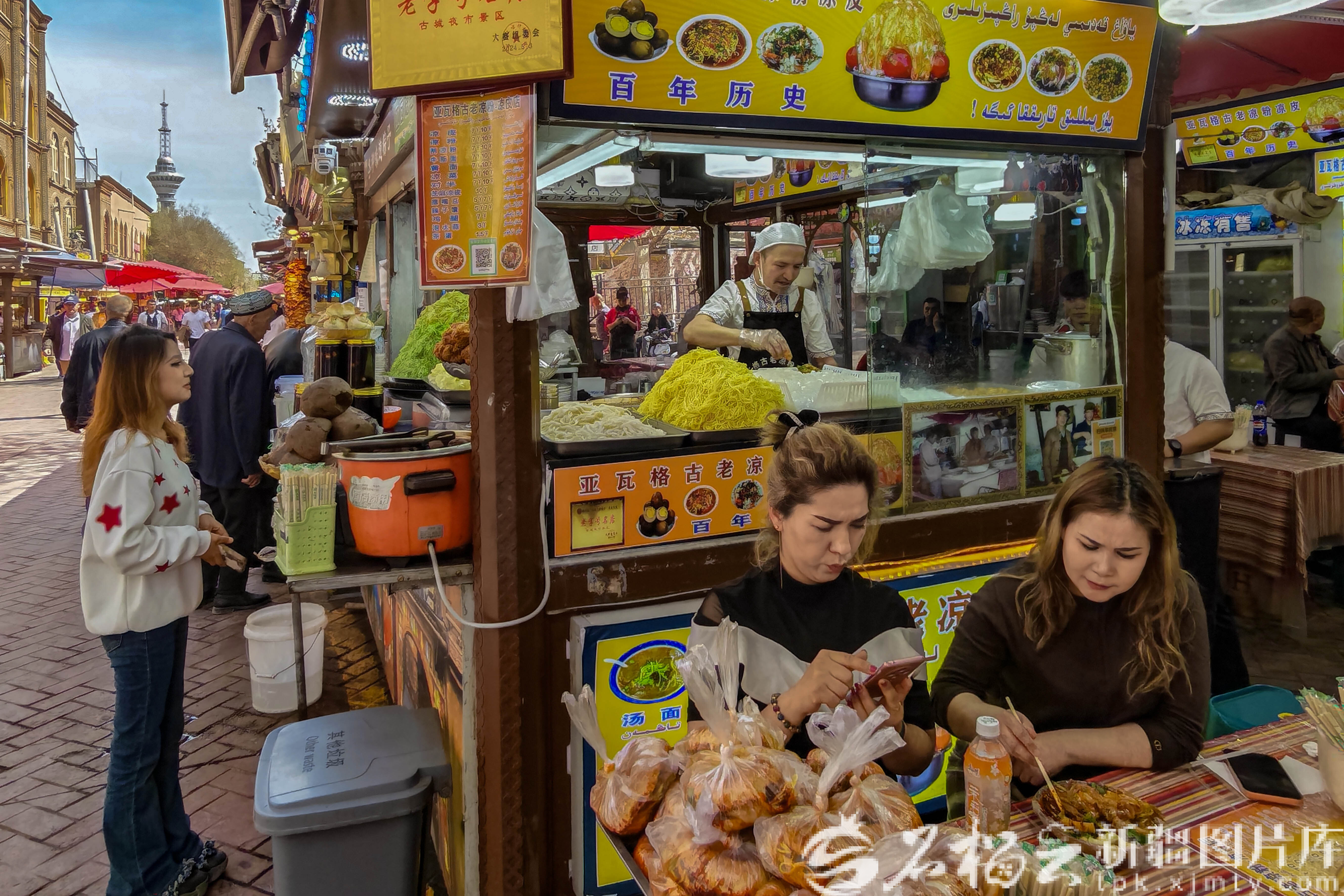 4月2日,游客在喀什古城景区汗巴扎品尝美食。