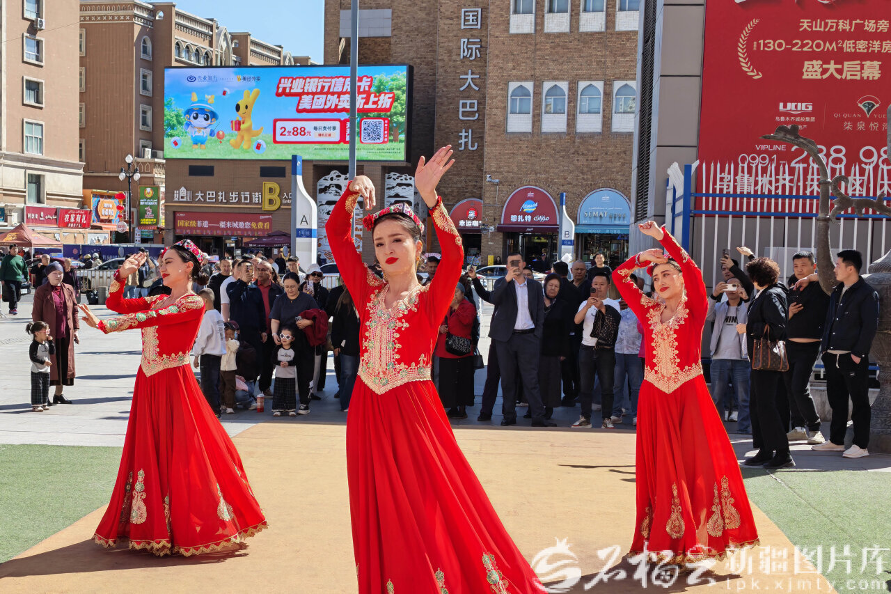 石榴云/新疆日报讯(记者 蔡增乐摄影报道)“新疆的歌舞热情奔放,一登场,便把春日的鲜活与热情尽数展现!”4月5日,在新疆国际大巴扎歌舞表演现场,来自西安的游客王海民兴奋地说。王海民和家人刚从西安飞抵乌鲁木齐,就专程赶来大巴扎游览体验。