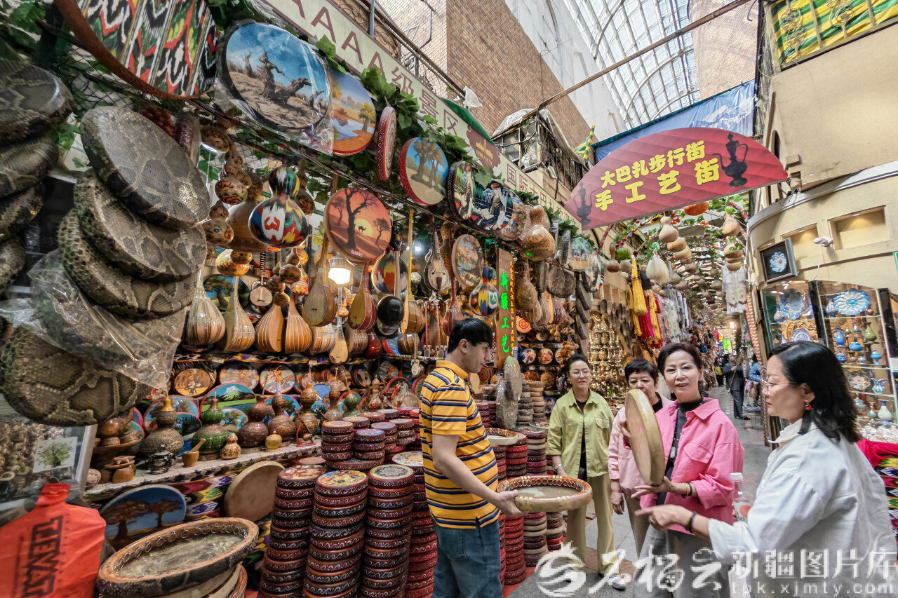 4月5日,游客在新疆国际大巴扎景区选购手鼓。