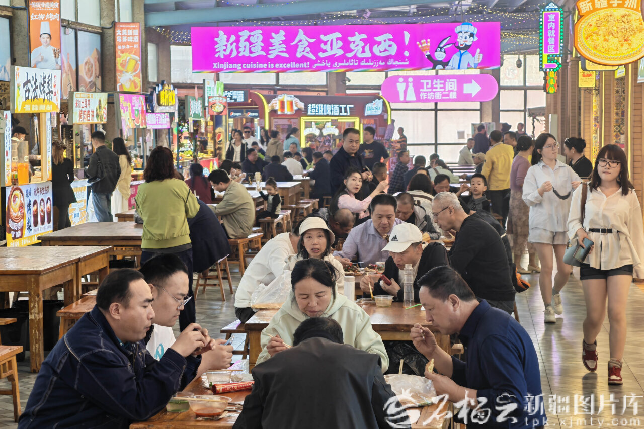 4月5日,游客在新疆国际大巴扎景区美食街品尝美食。