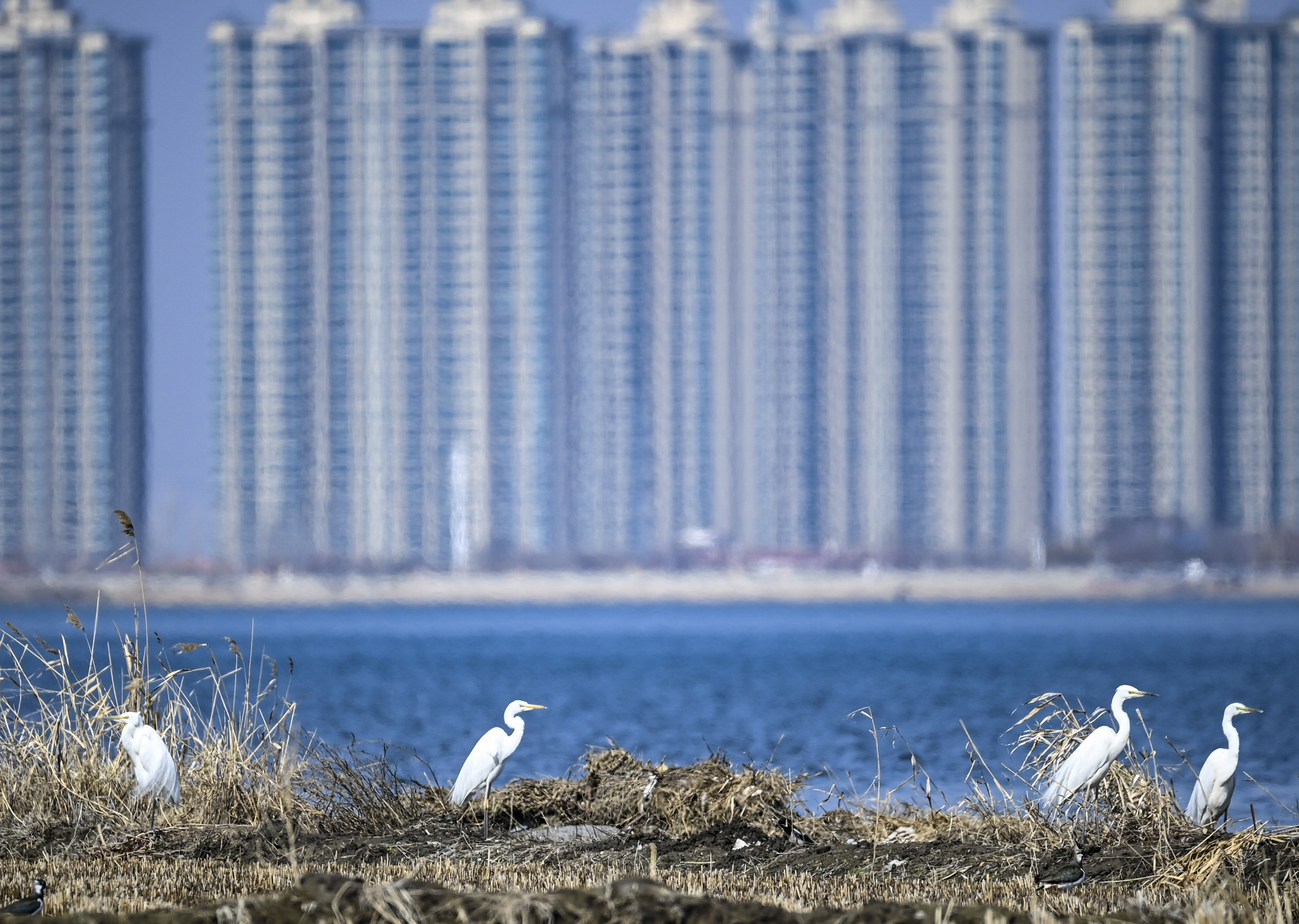 4月1日,白鹭在位于乌鲁木齐市米东区的猛进水库栖息。近年来,乌鲁木齐市以河(湖)长制为重要抓手,通过上游源头治理、下游生态修复协同发力,全市水源地水质优良比例显著提升。石榴云/新疆日报记者 汤永摄