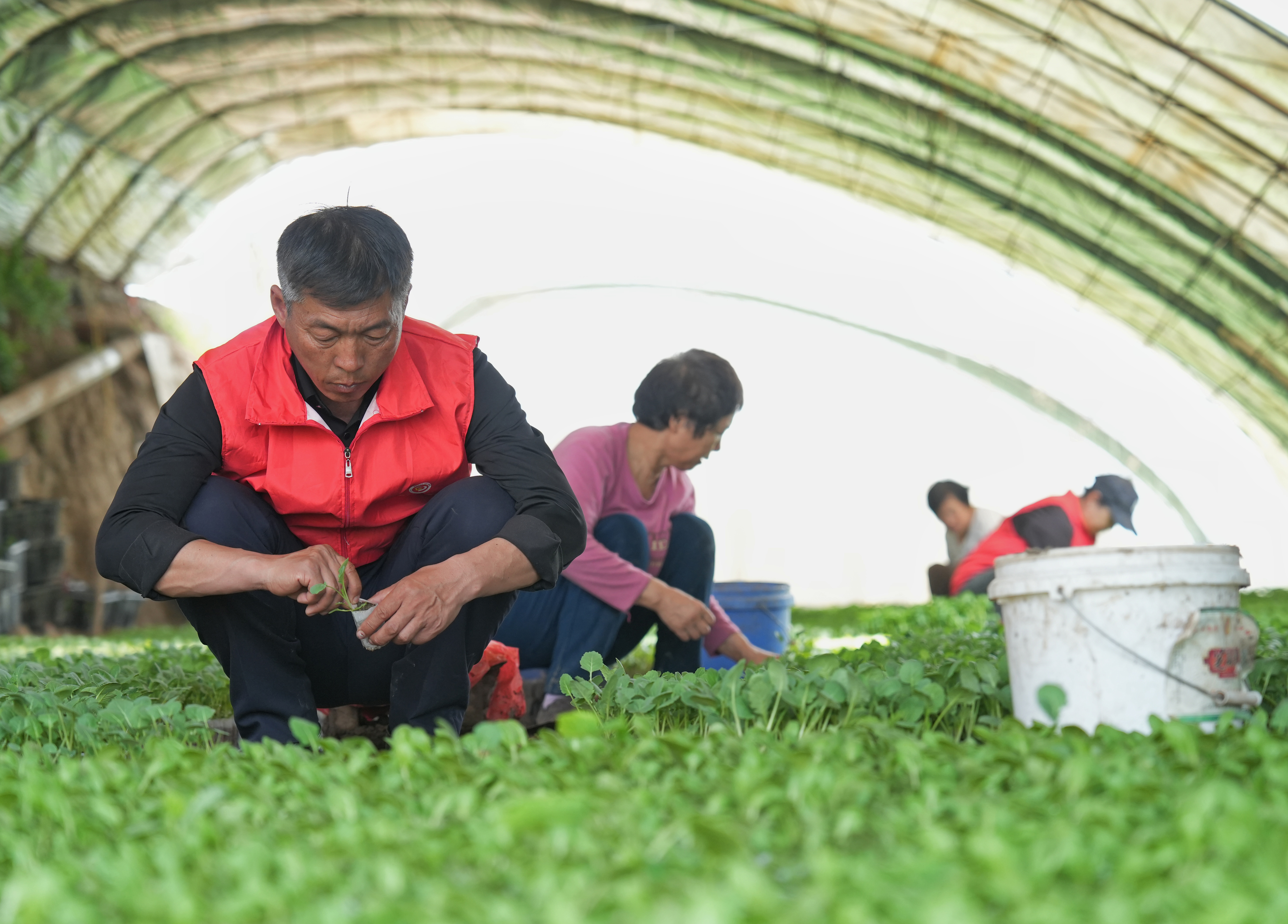 4月1日,沙湾市乌兰乌苏镇党员干部在该镇下四宫村育苗大棚,帮助农户进行菜苗移栽、除草作业。近日,沙湾市广泛开展“抢抓农时保春播 志愿服务助振兴”活动,广大党员干部深入田间地头,助力村民解决春耕生产难题。杨文秀摄