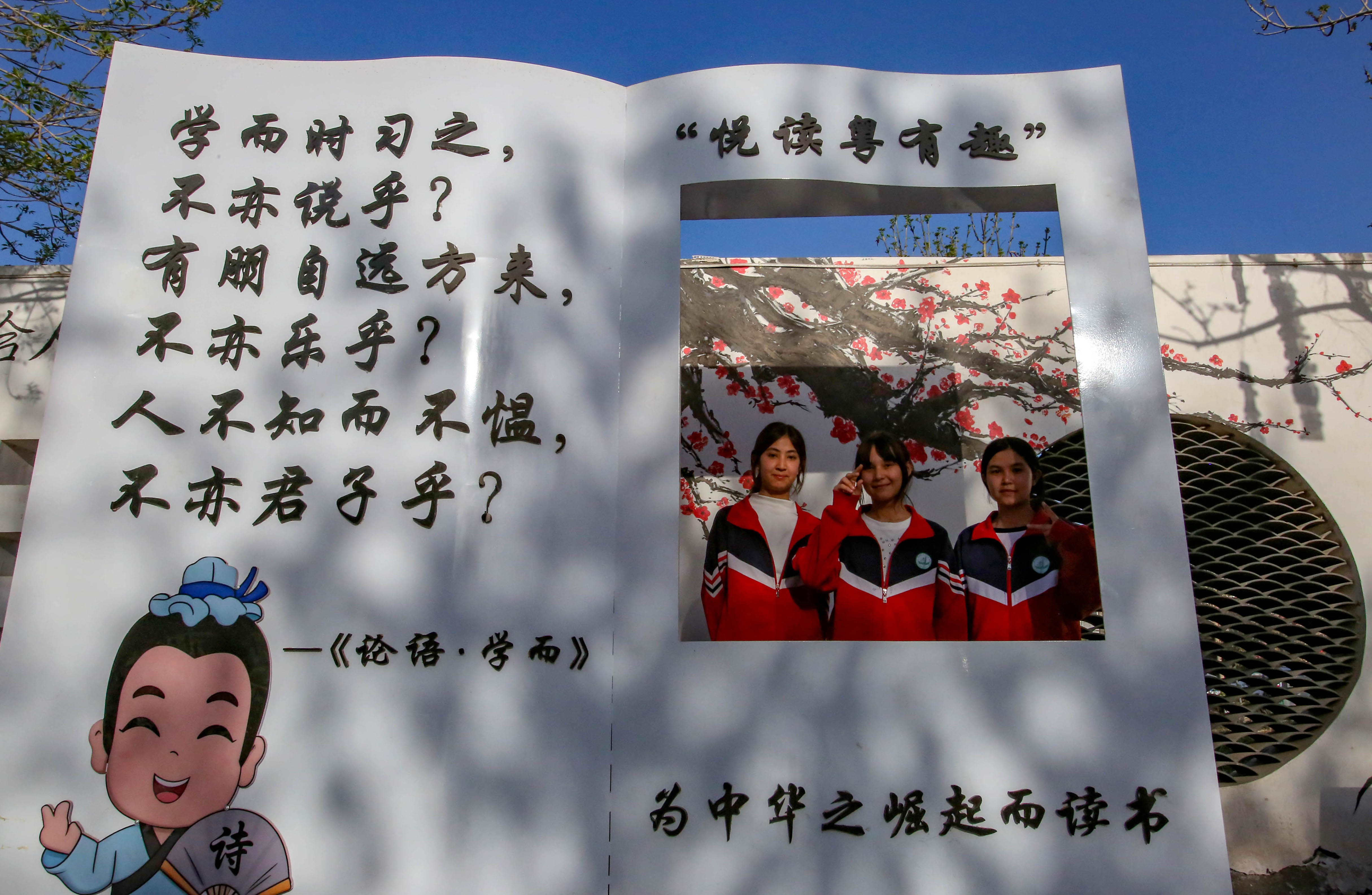 4月1日,学生在位于伽师县巴仁镇平安路的“悦读粤有趣”城市书吧合影留念。这座由广东省援建的书吧总面积达189平方米,为各族群众打造了一个集阅读、学习、互动于一体的现代化文化阵地。开放半年来,已累计接待读者超4万人次。石榴云/新疆日报记者 蔡增乐摄