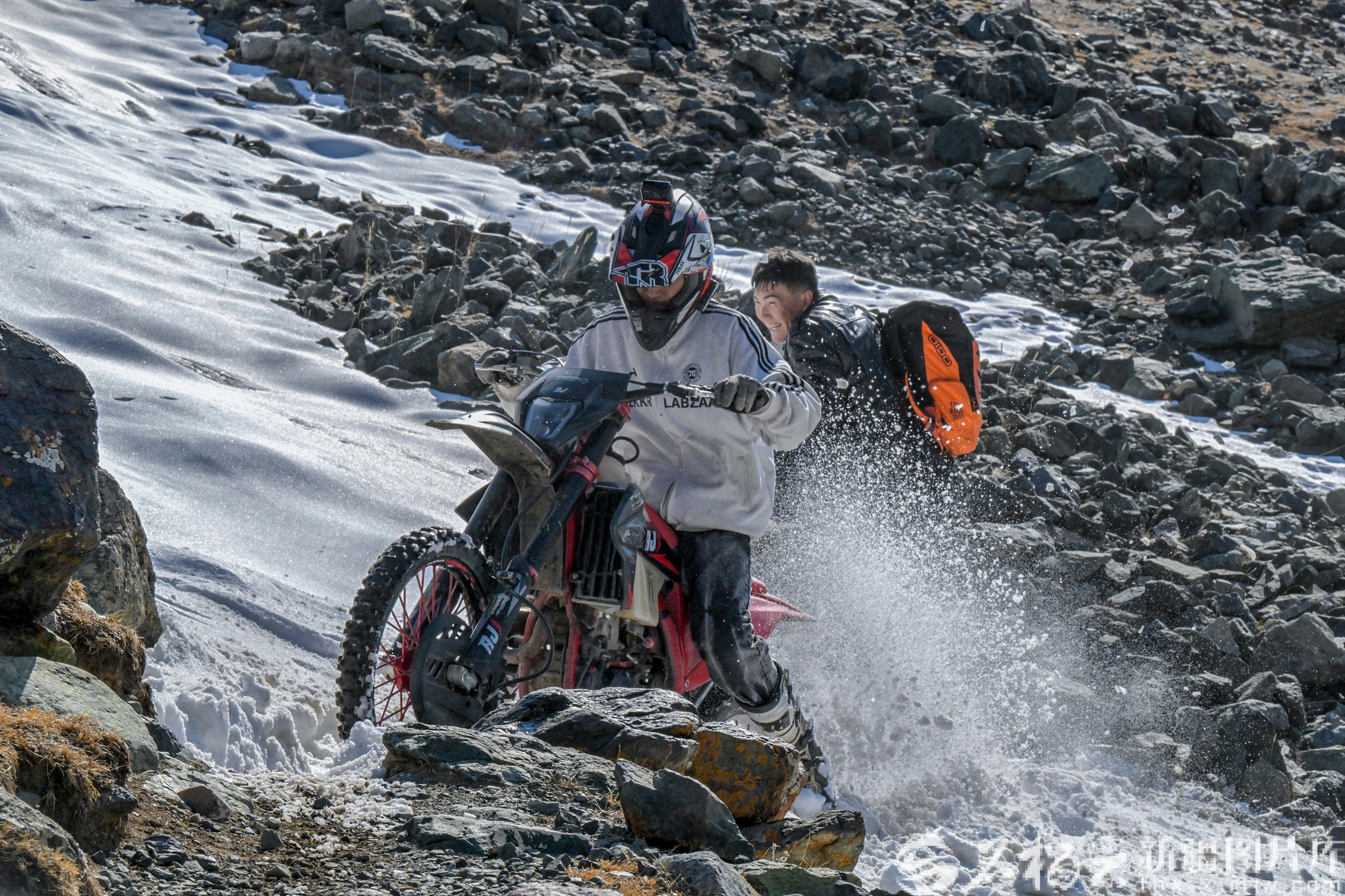 4月6日,越野摩托车爱好者在乌鲁木齐周边骑行穿越积雪路面。
