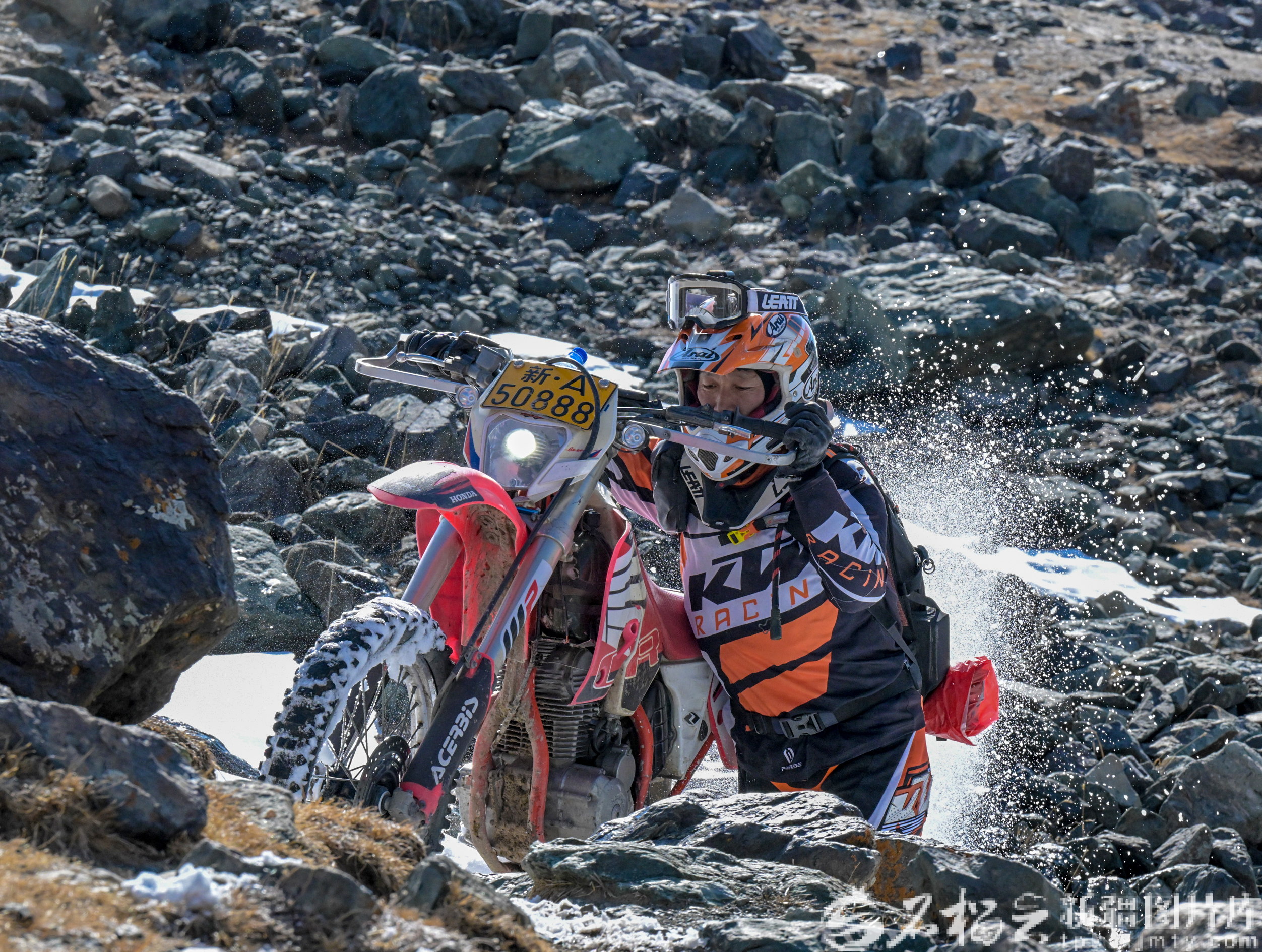 4月6日,越野摩托车爱好者在乌鲁木齐周边骑行翻越石头路面。