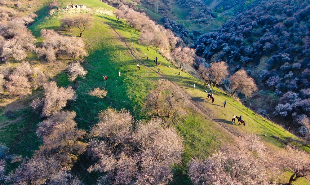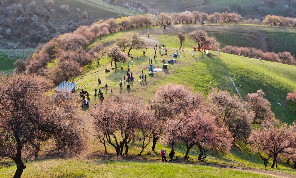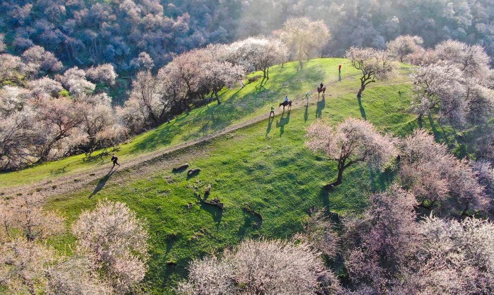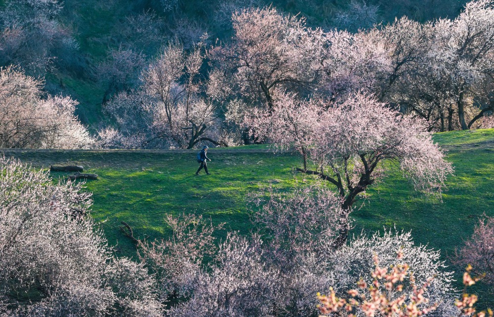 4月5日,那拉提杏花谷万亩野杏林,迎来踏青赏花热潮。