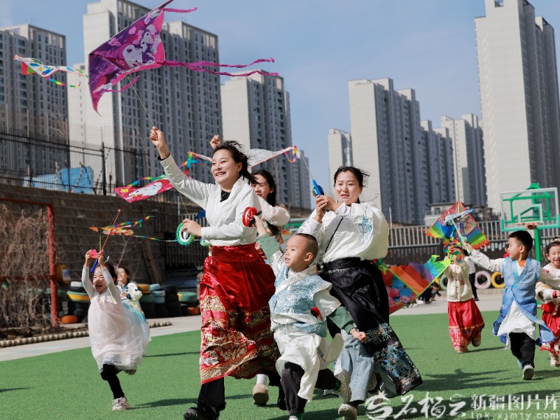 4月2日,乌鲁木齐经开区(头屯河区)嵩山街街道洪湖社区联合辖区幼儿园,开展“学民俗 迎清明”主题实践活动,社区干部和老师带着孩子们了解清明节的知识、放风筝。邹新婷摄