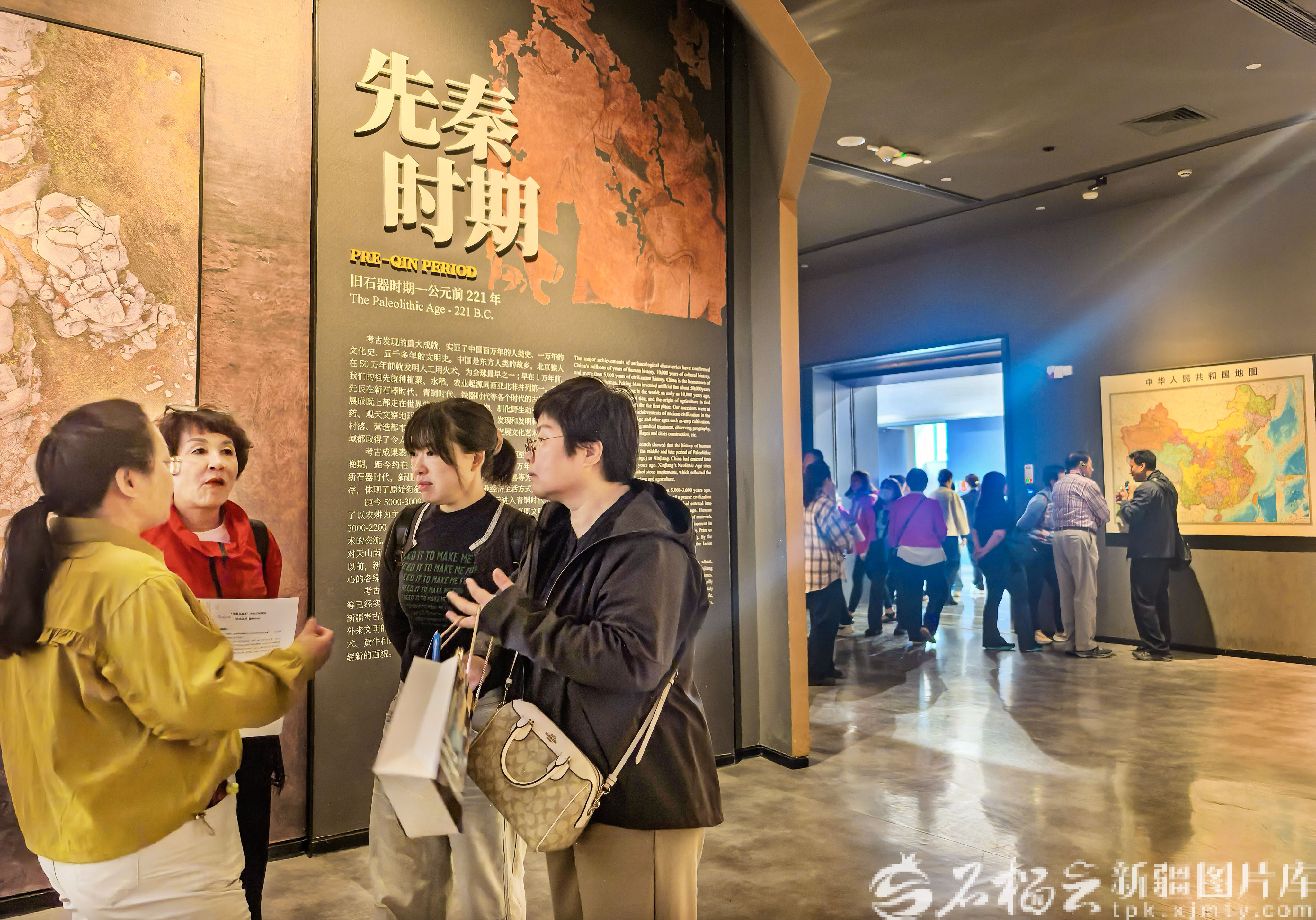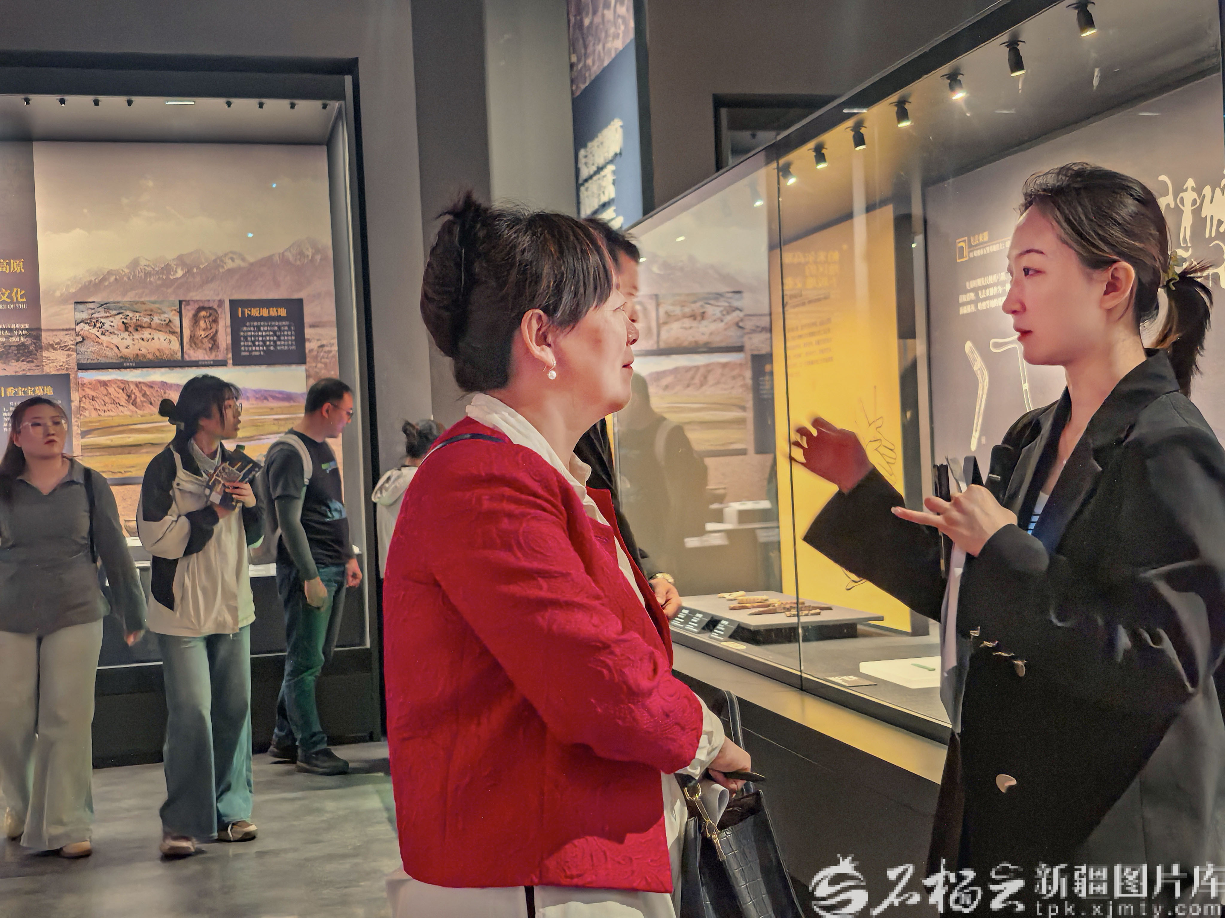 4月8日,在新疆博物馆“帕米尔高原文化”主题展区,志愿者与专业讲解员沟通交流讲解技巧。