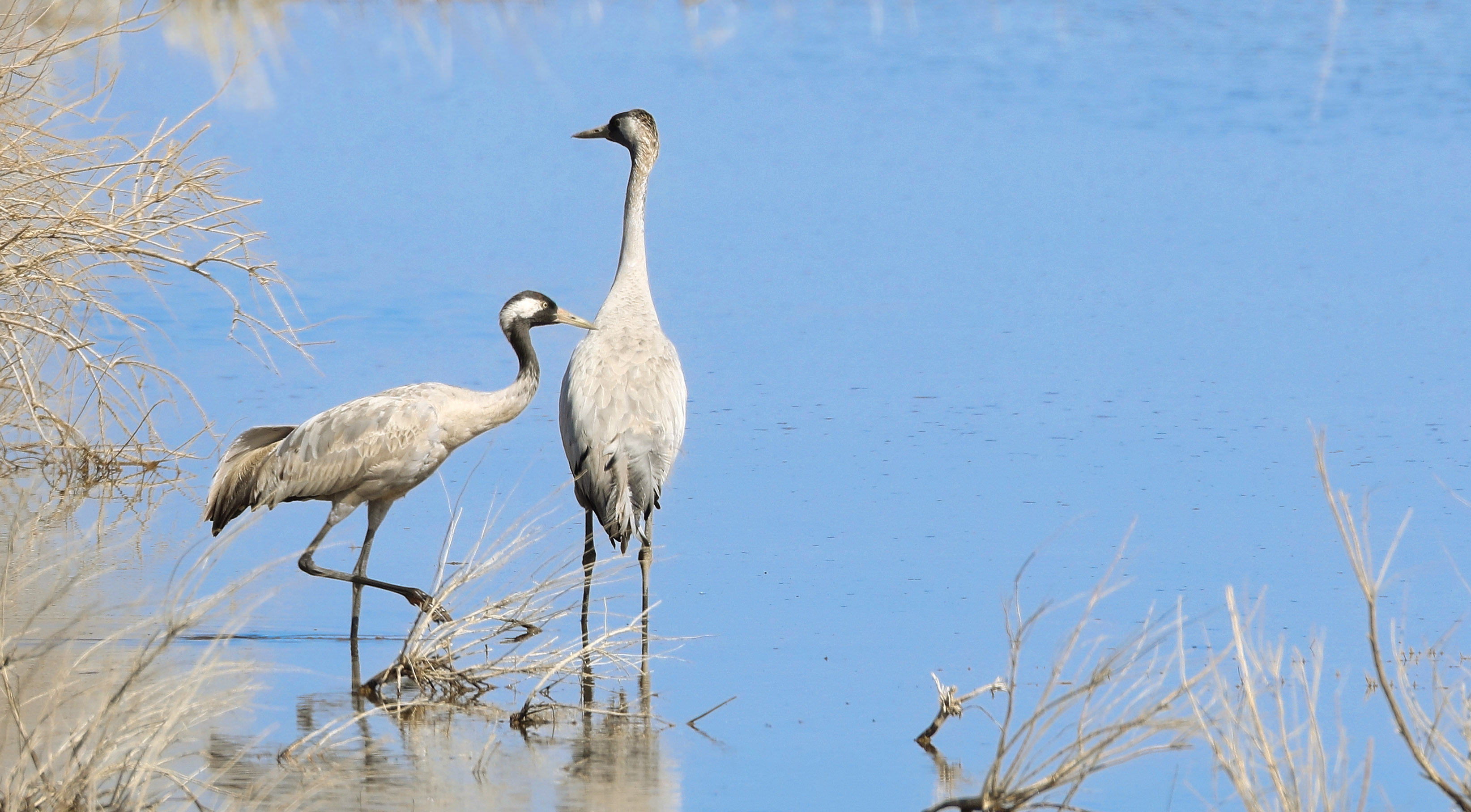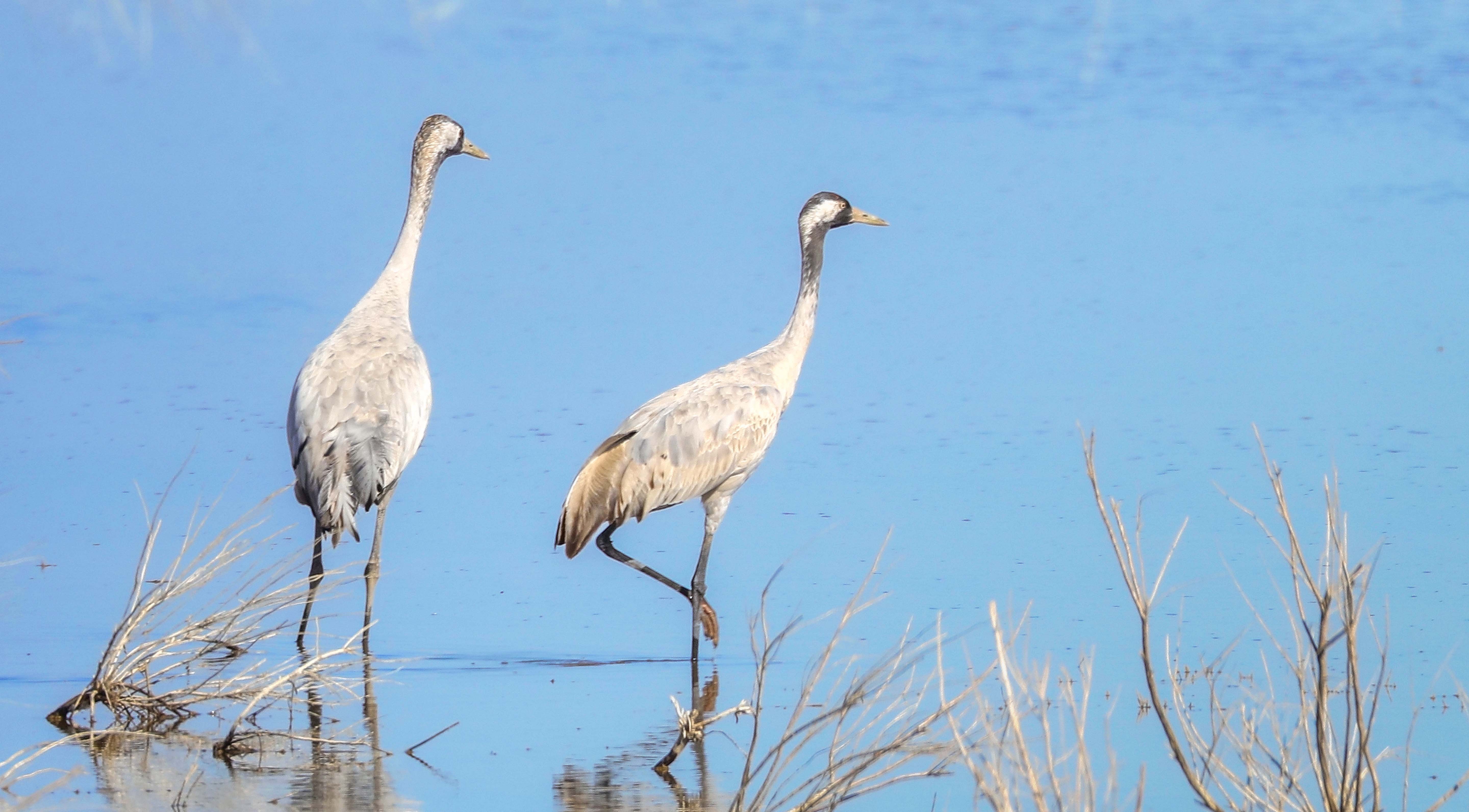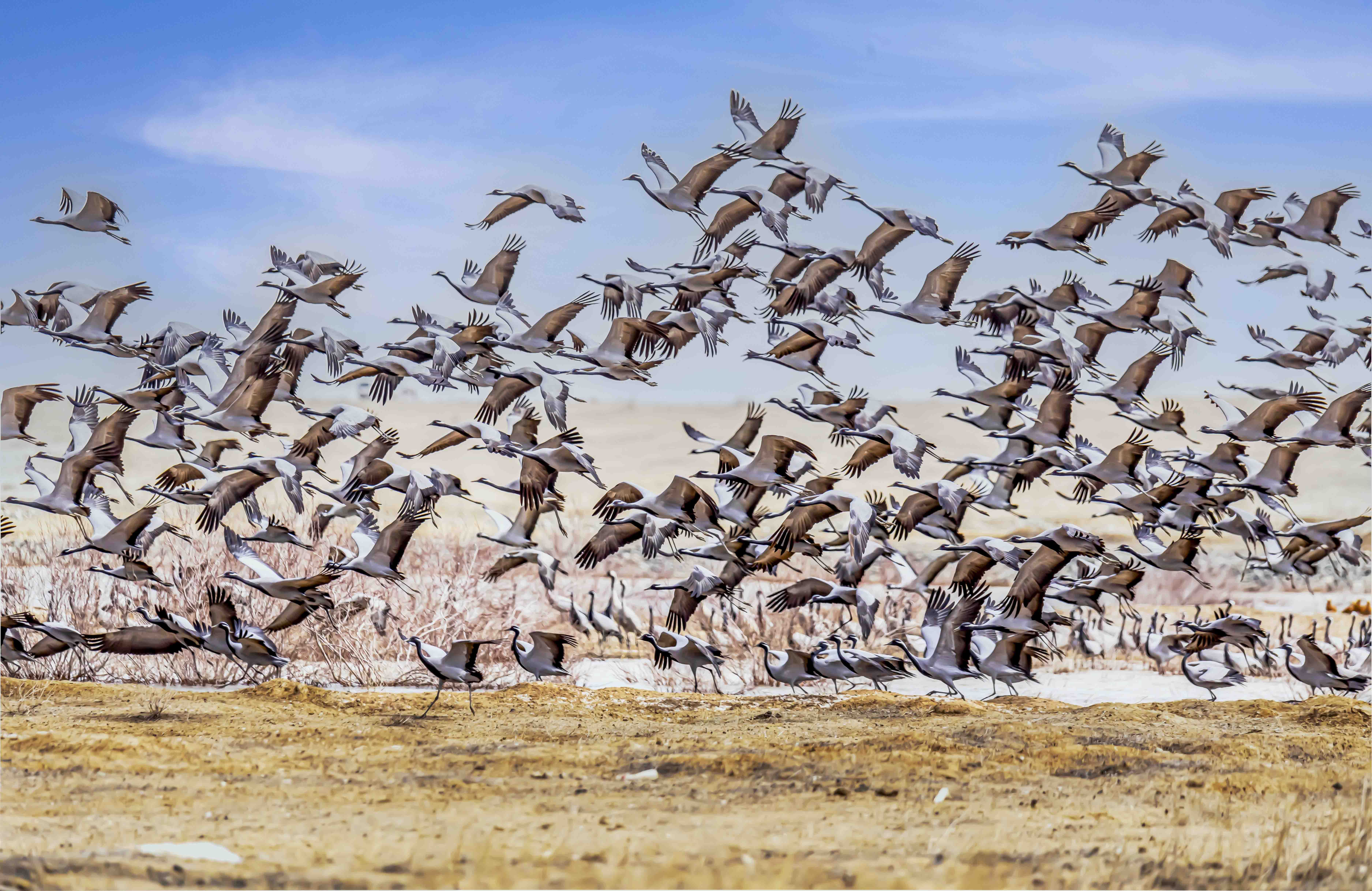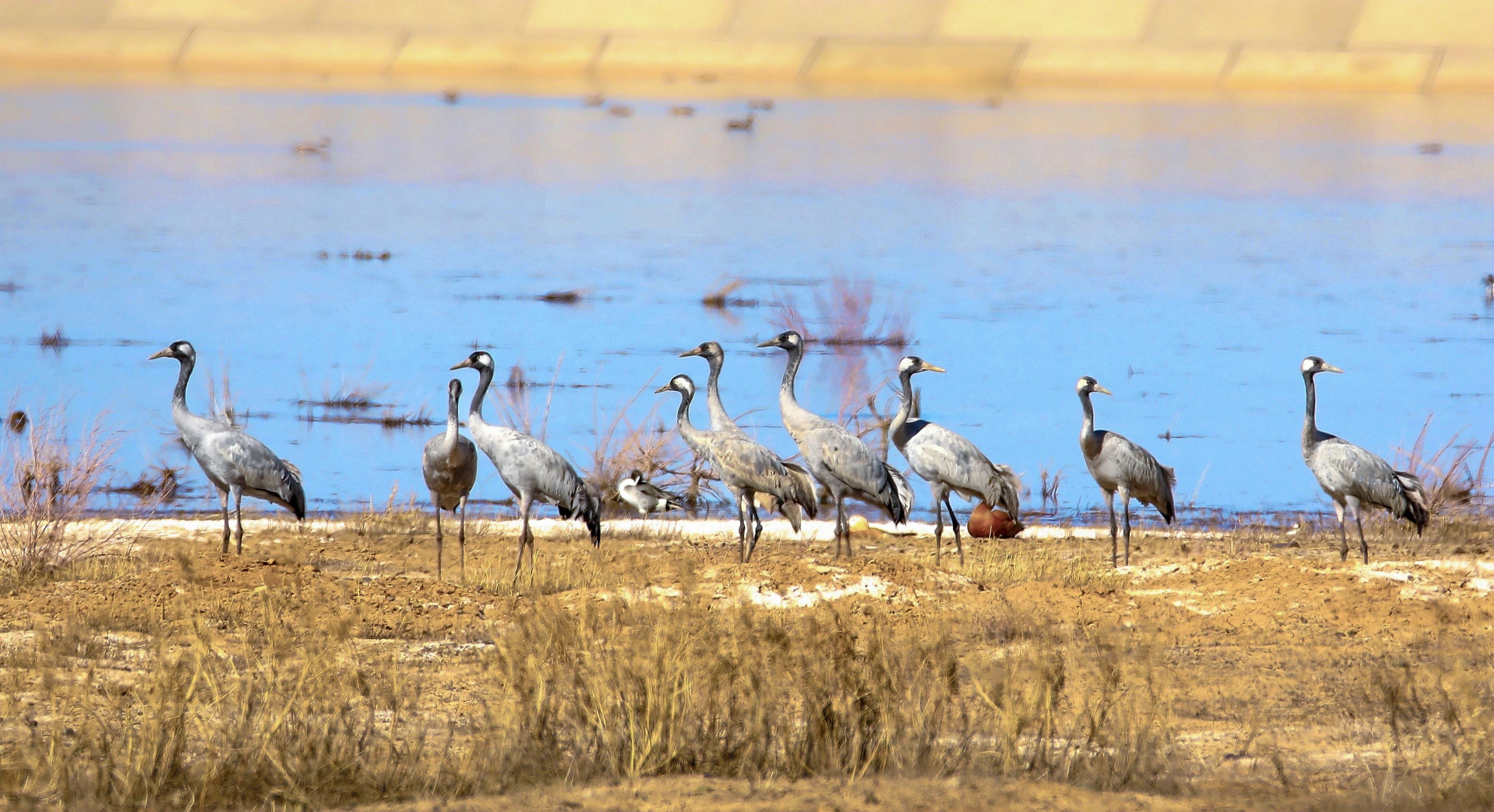 4月中旬,新疆昌吉回族自治州木垒哈萨克自治县草原坎儿井景区内的水库,迎来大批北迁候鸟。白鹭、灰鹤、蓑羽鹤等在此停歇觅食、嬉戏飞舞,为春日的木垒勾勒出一幅生机盎然的生态画卷。