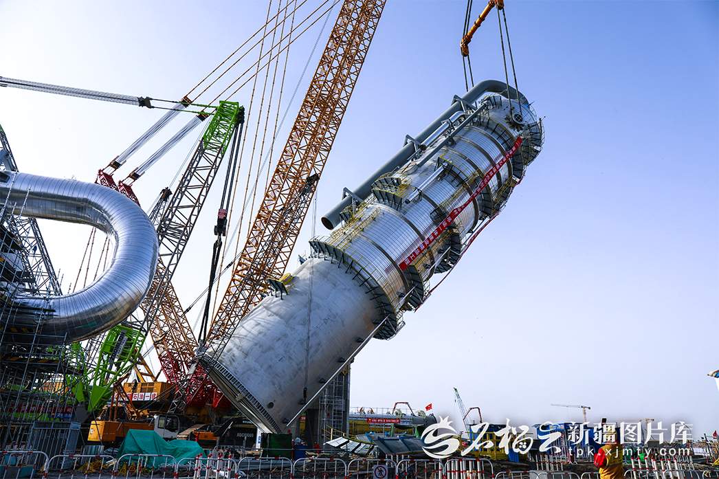 2024年9月17日,位于库尔勒上库工业园区的中国石油独山子石化塔里木120万吨/年二期乙烯项目建设现场,我国自主研制的“大国重器”、有着“神州第一吊”美誉的4000吨级履带式起重机将乙烯装置急冷水塔缓缓吊起,标志着该项目正式进入设备安装阶段。于文亮摄