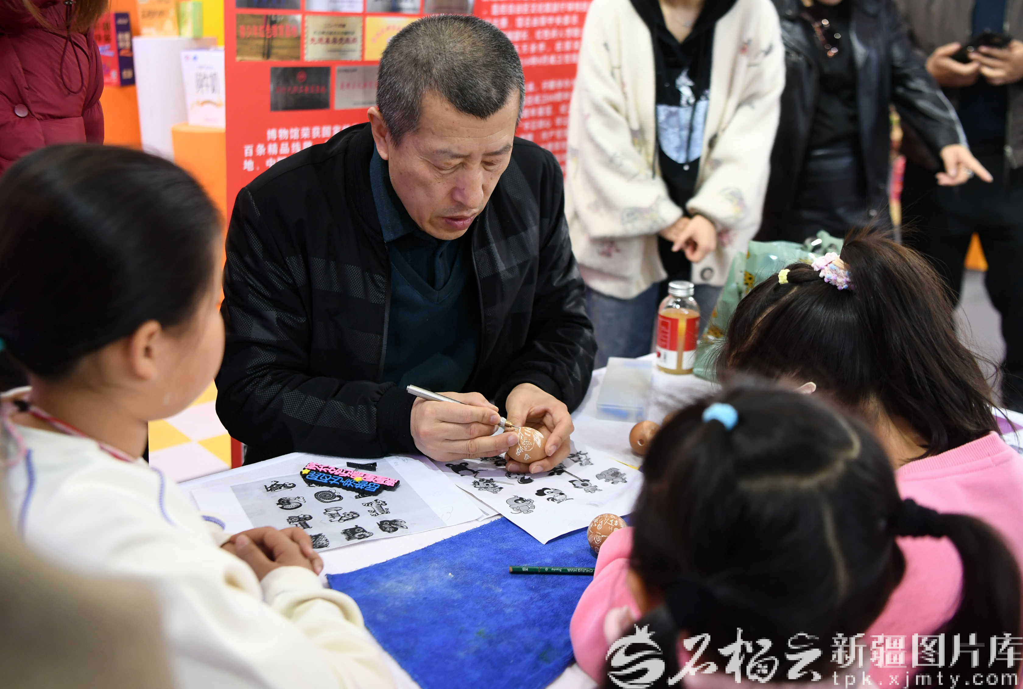 3月28日,在第七届新疆春季旅游博览会上,魏登军在给小朋友展示蛋雕技艺。