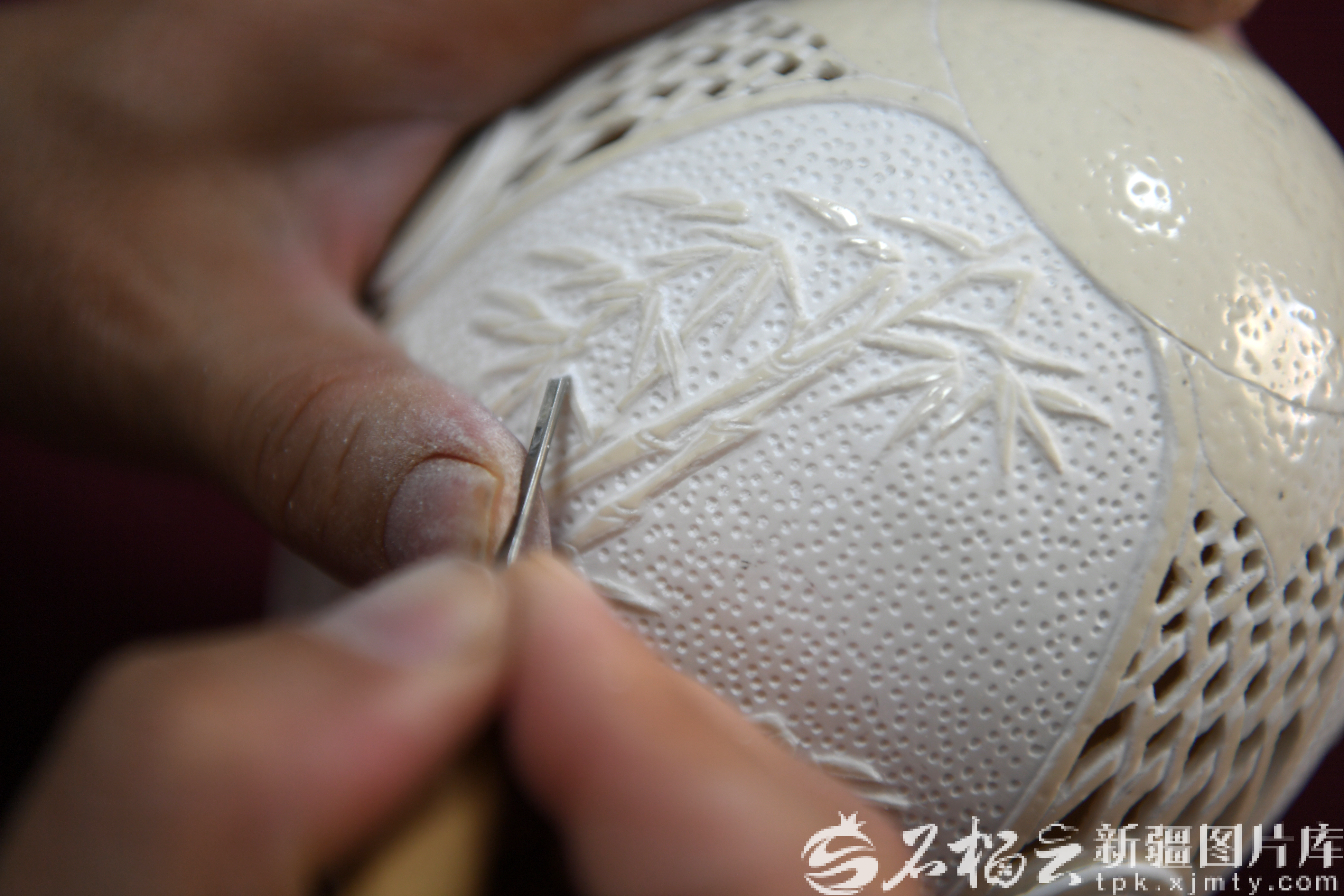 4月13日,魏登军在创作鸵鸟蛋雕作品。
