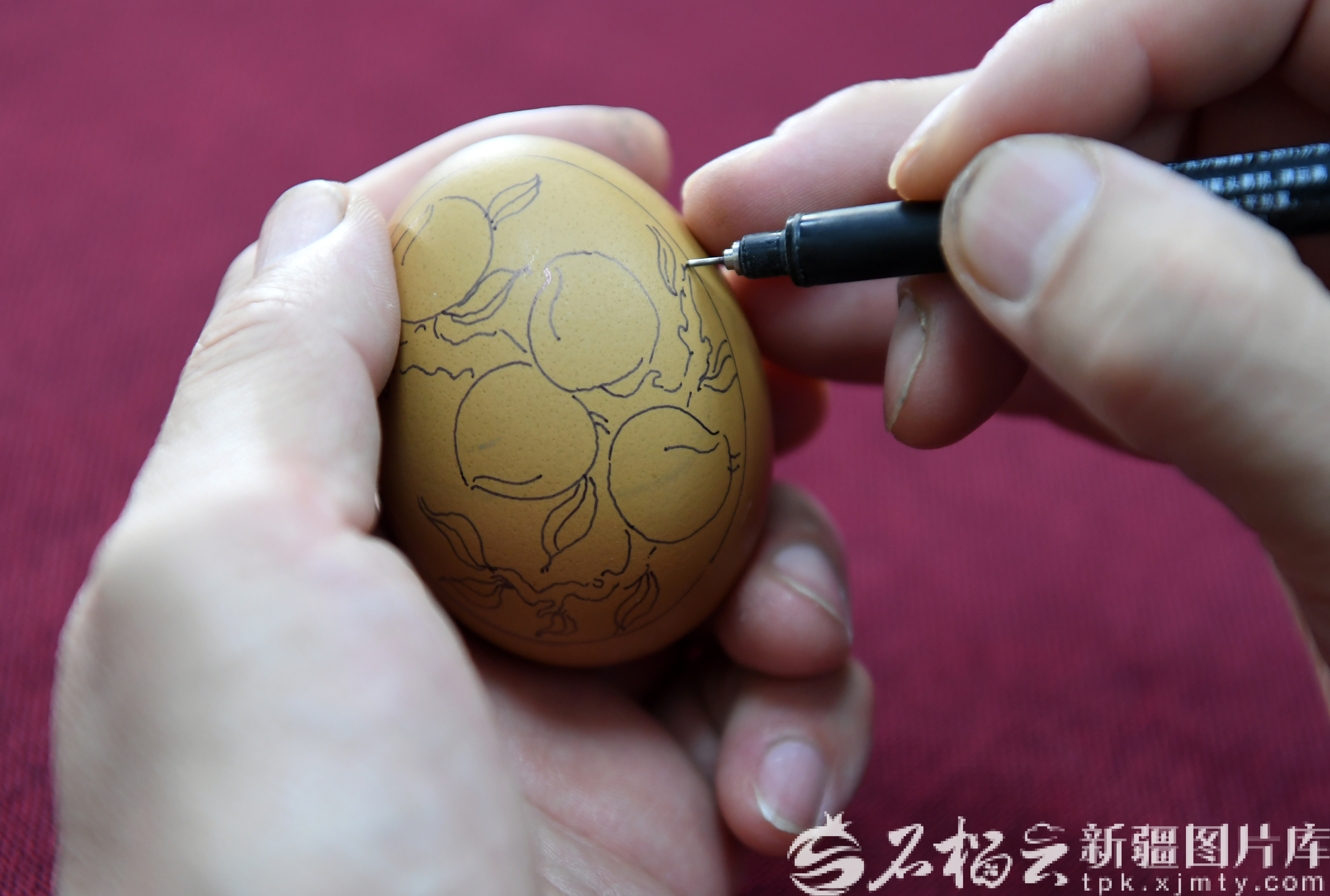 4月13日,魏登军在鸡蛋壳上勾勒图案。