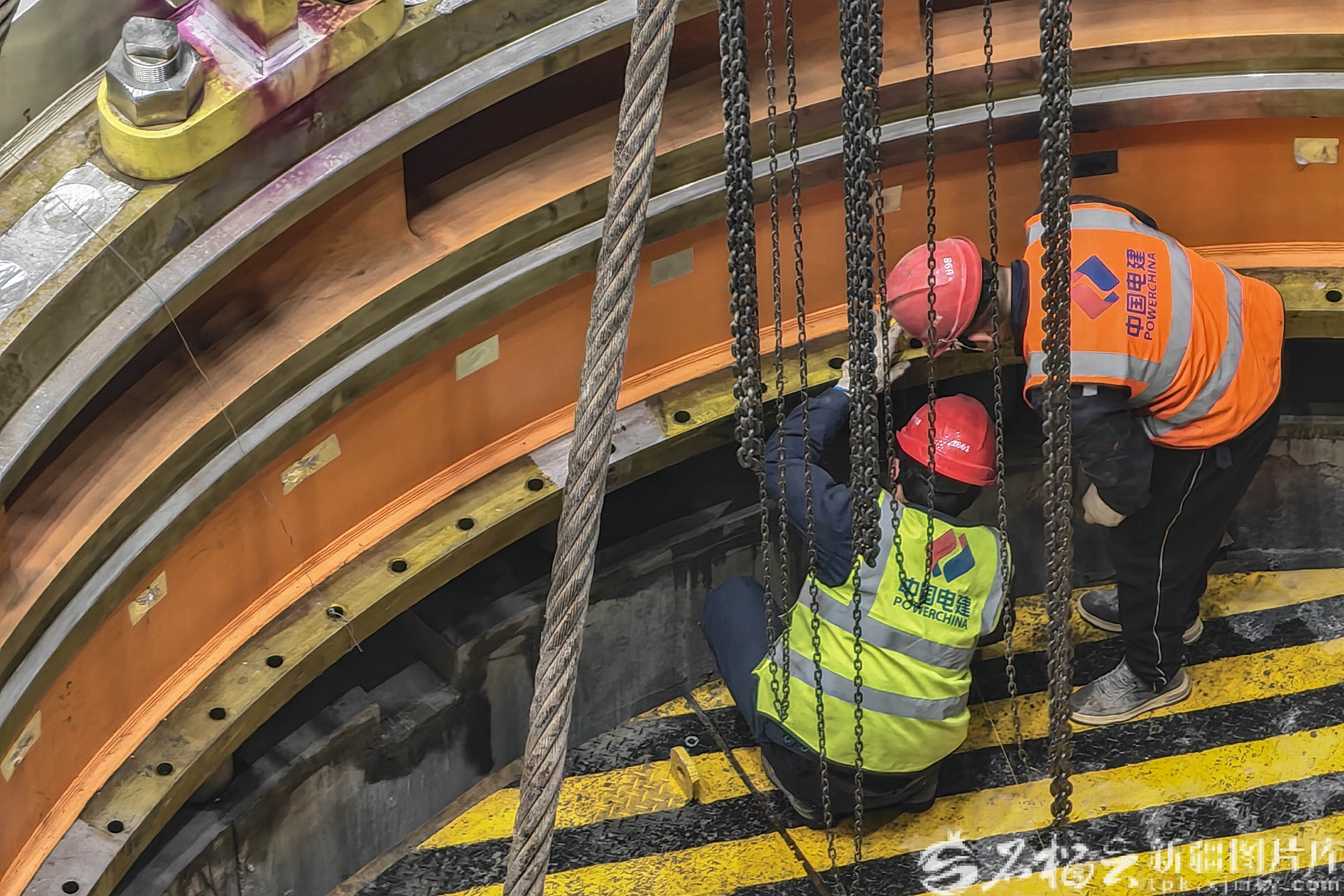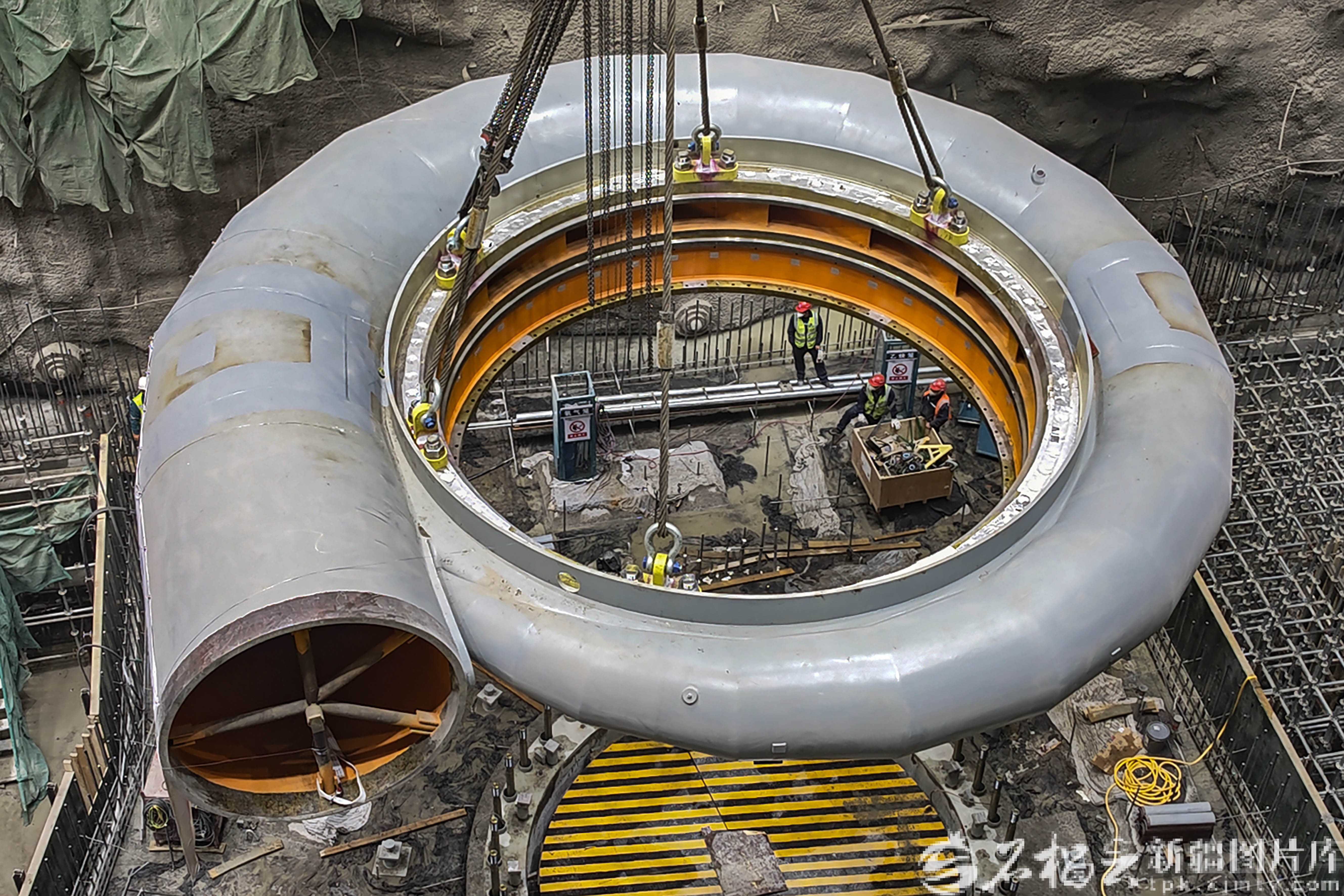 4月16日,施工人员在国网新源新疆哈密抽水蓄能电站主厂房内吊装首台机组蜗壳座环。