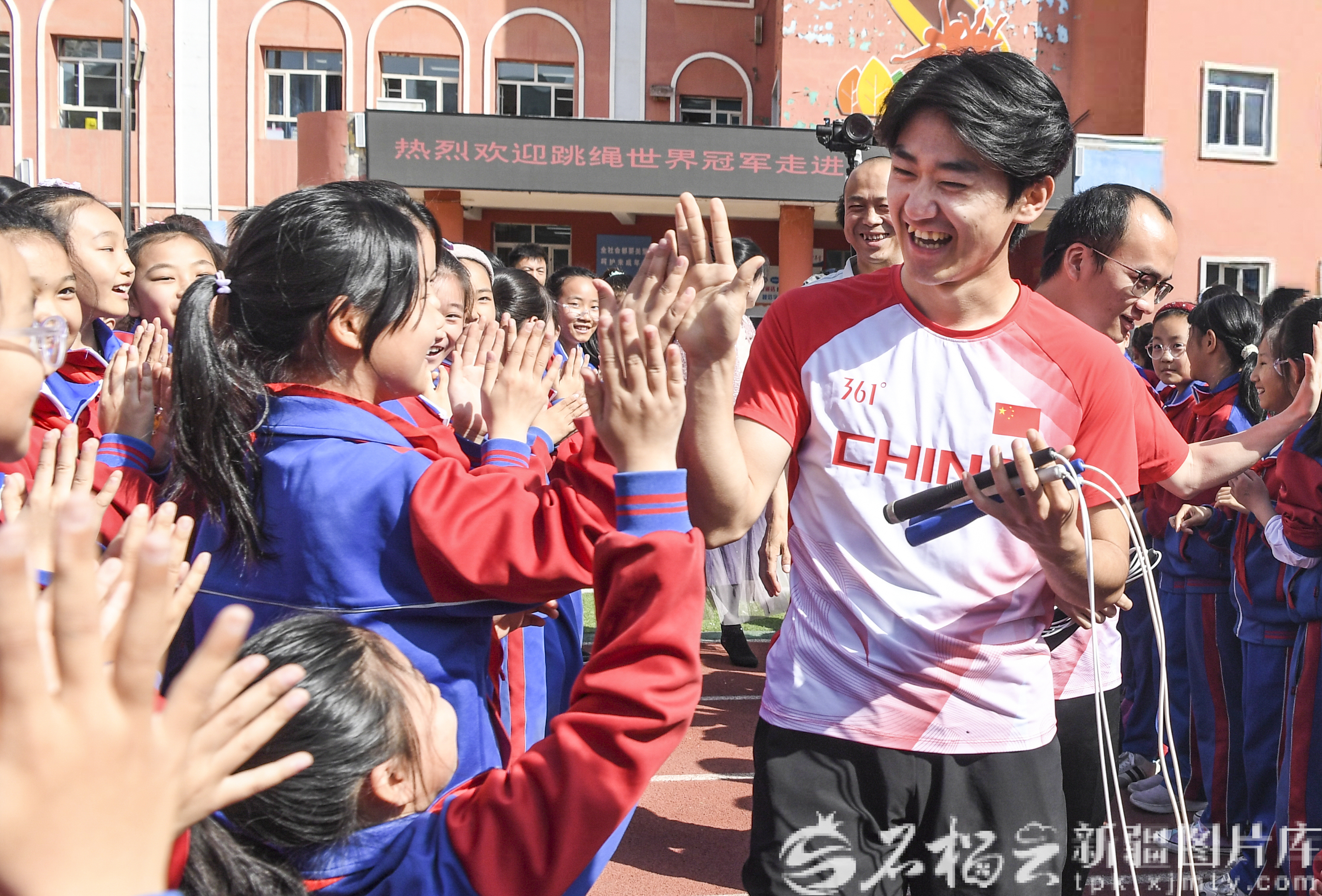 4月17日,跳绳世界冠军李永琪与同学们击掌互动。