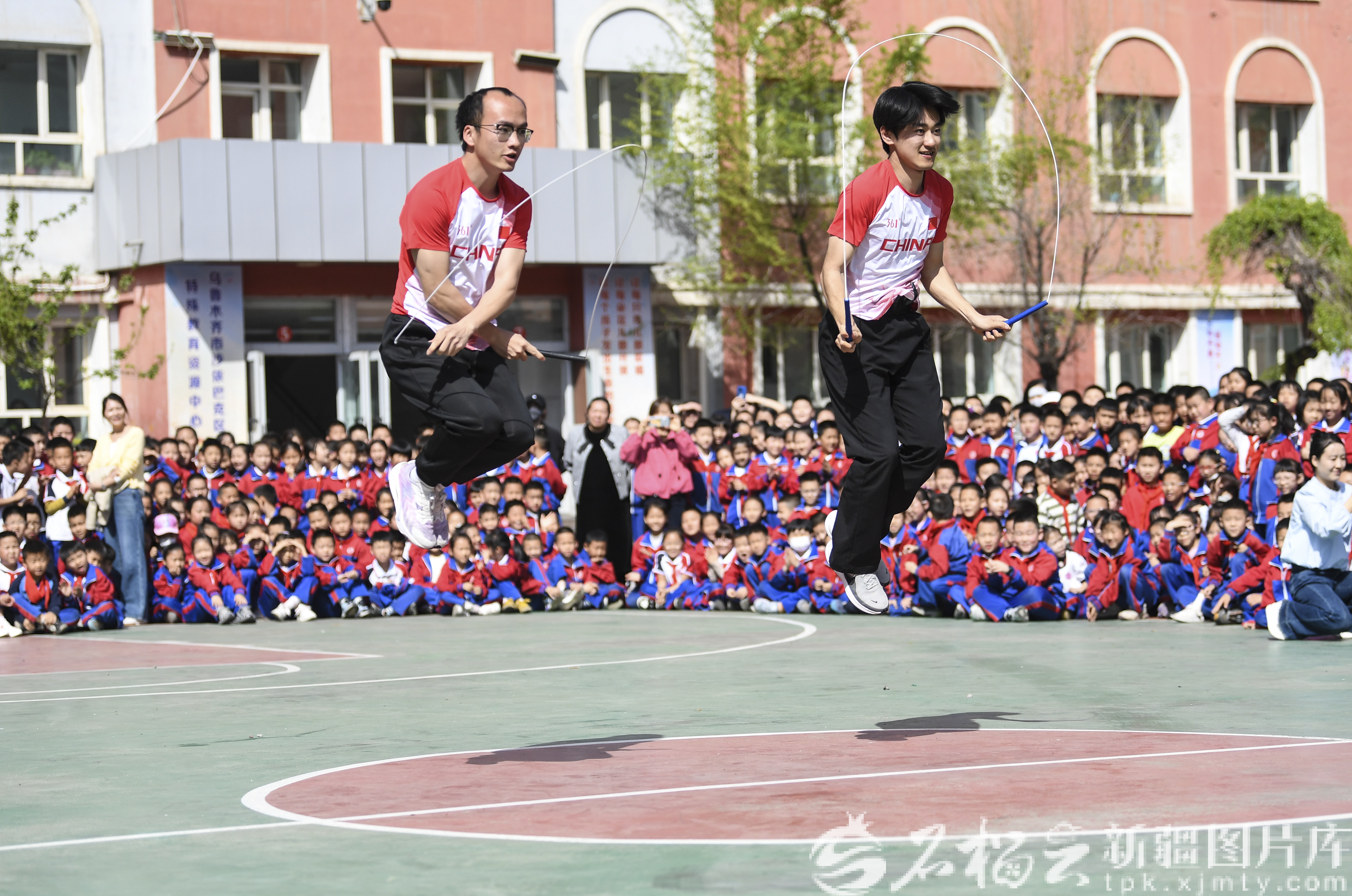 4月17日,跳绳世界冠军岑小林(左)、李永琪为乌鲁木齐市第26小学学生表演双人跳绳。