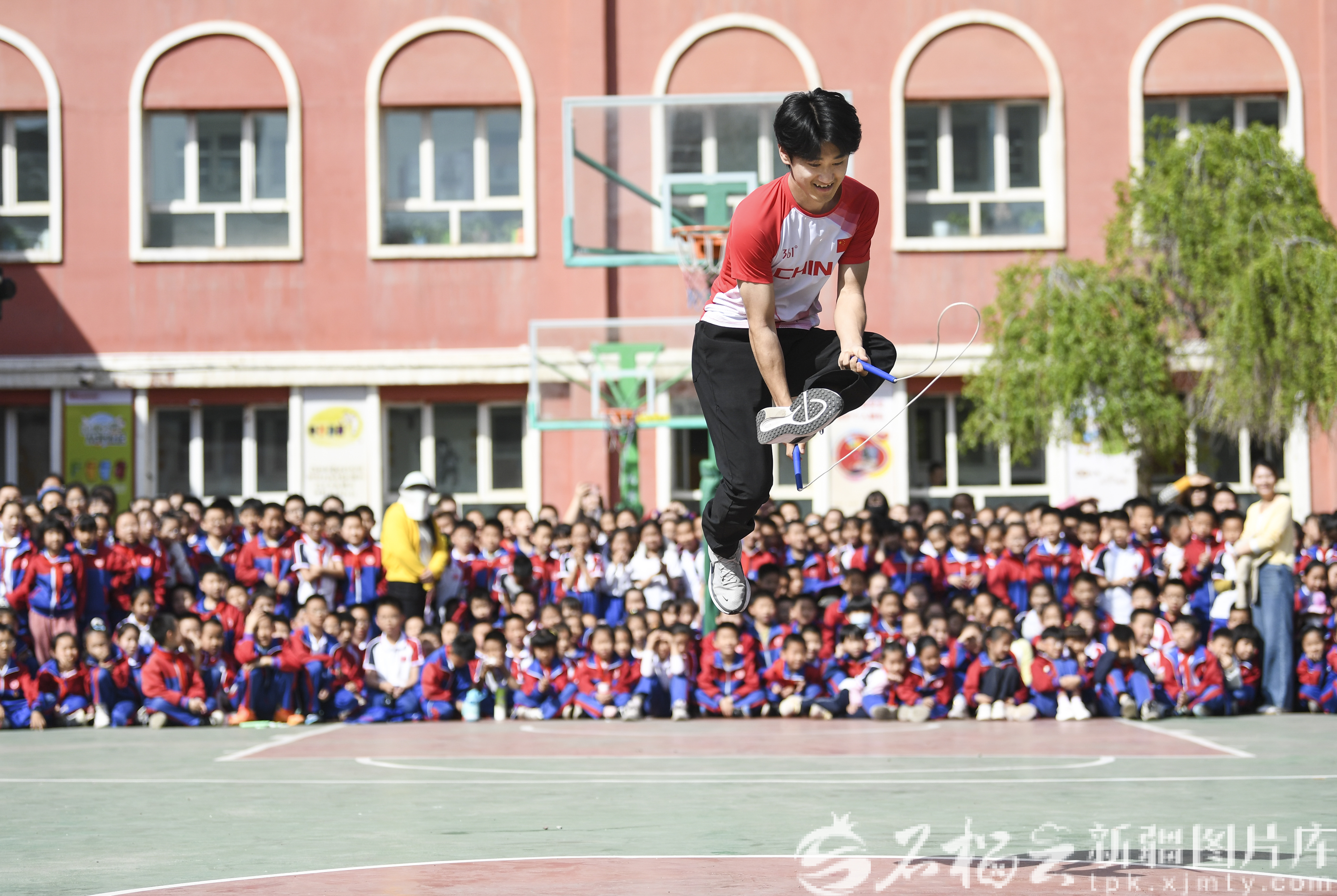 石榴云/新疆日报讯(记者 汤永摄影报道)4月17日,乌鲁木齐市沙依巴克区中小学跳绳“六个一”工程启动。乌鲁木齐市第26小学以“精一绳彩·榜样同行”为主题,开展跳绳世界冠军进校园活动。