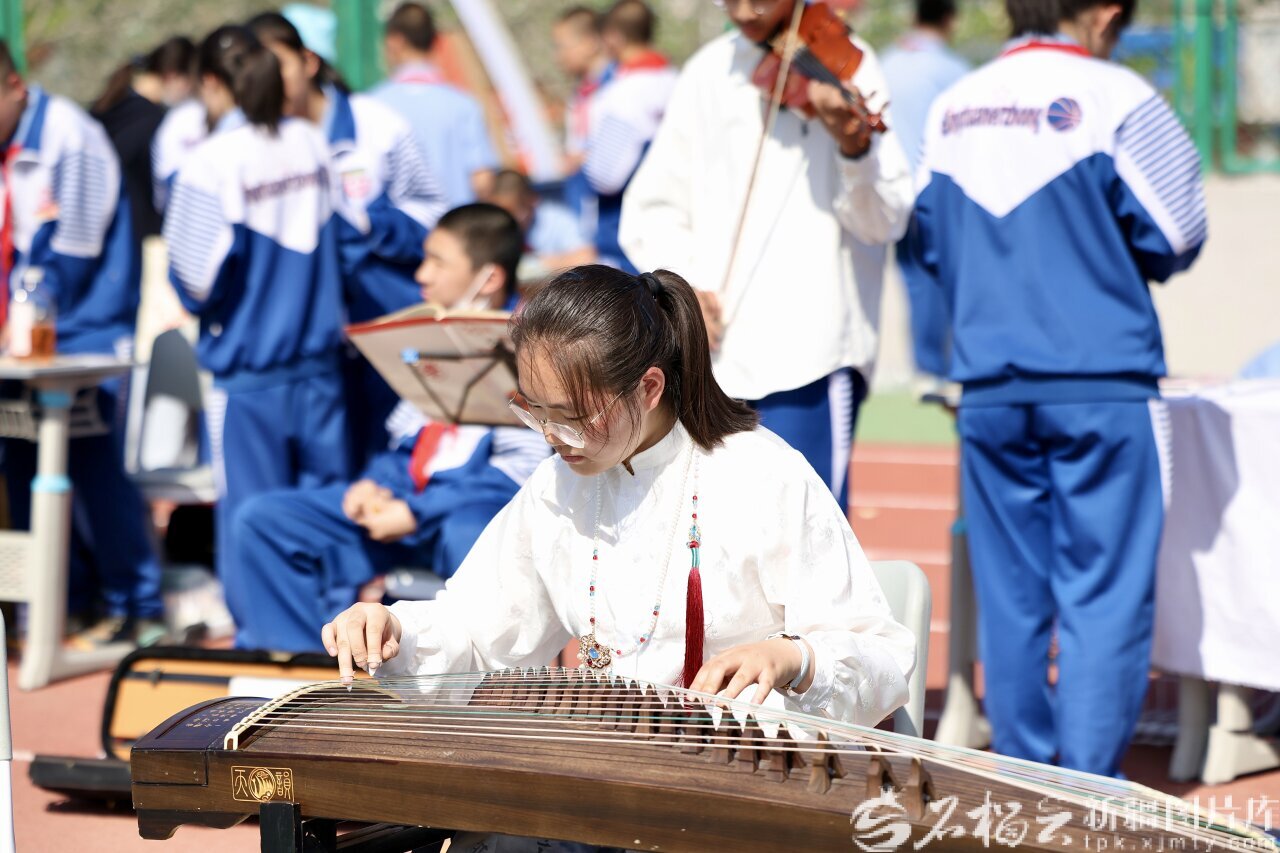 4月23日,游艺互动区同学们各展所长,一名同学正在弹奏古筝。