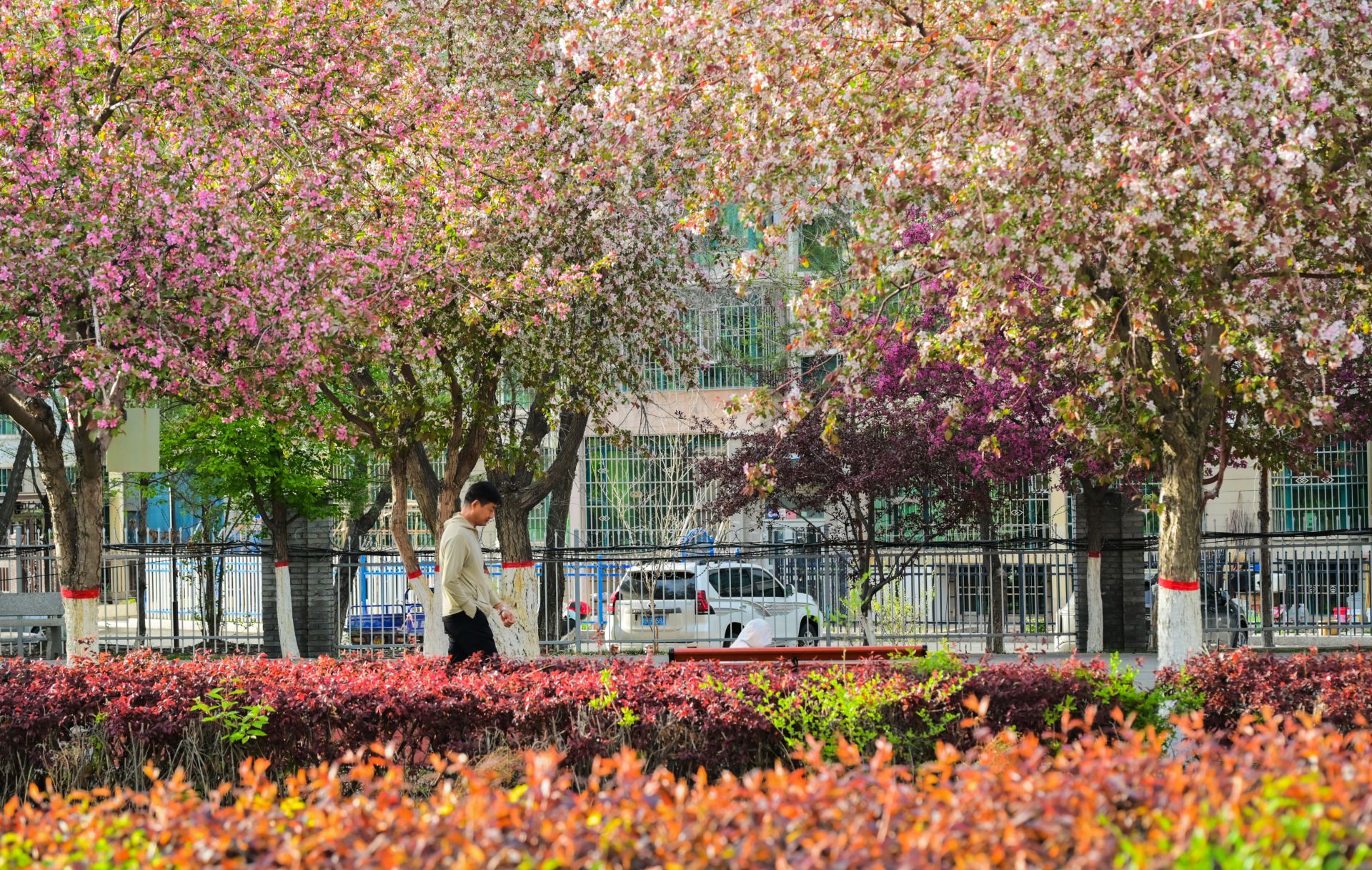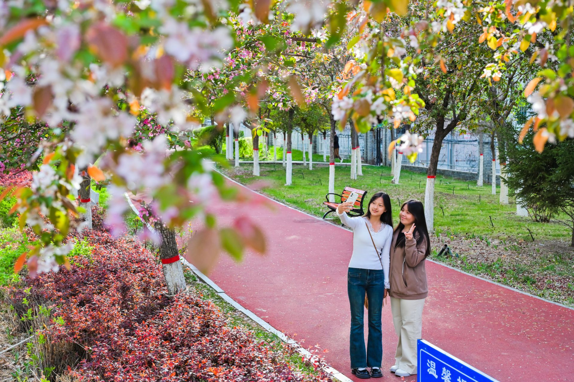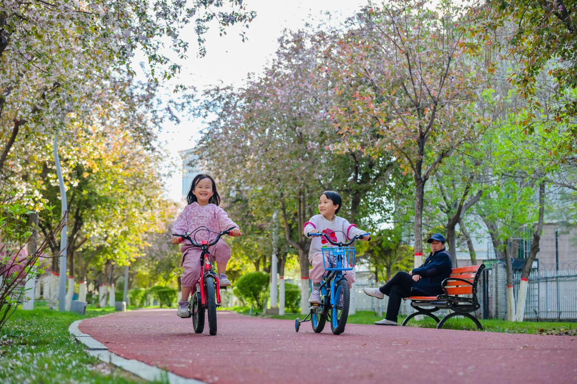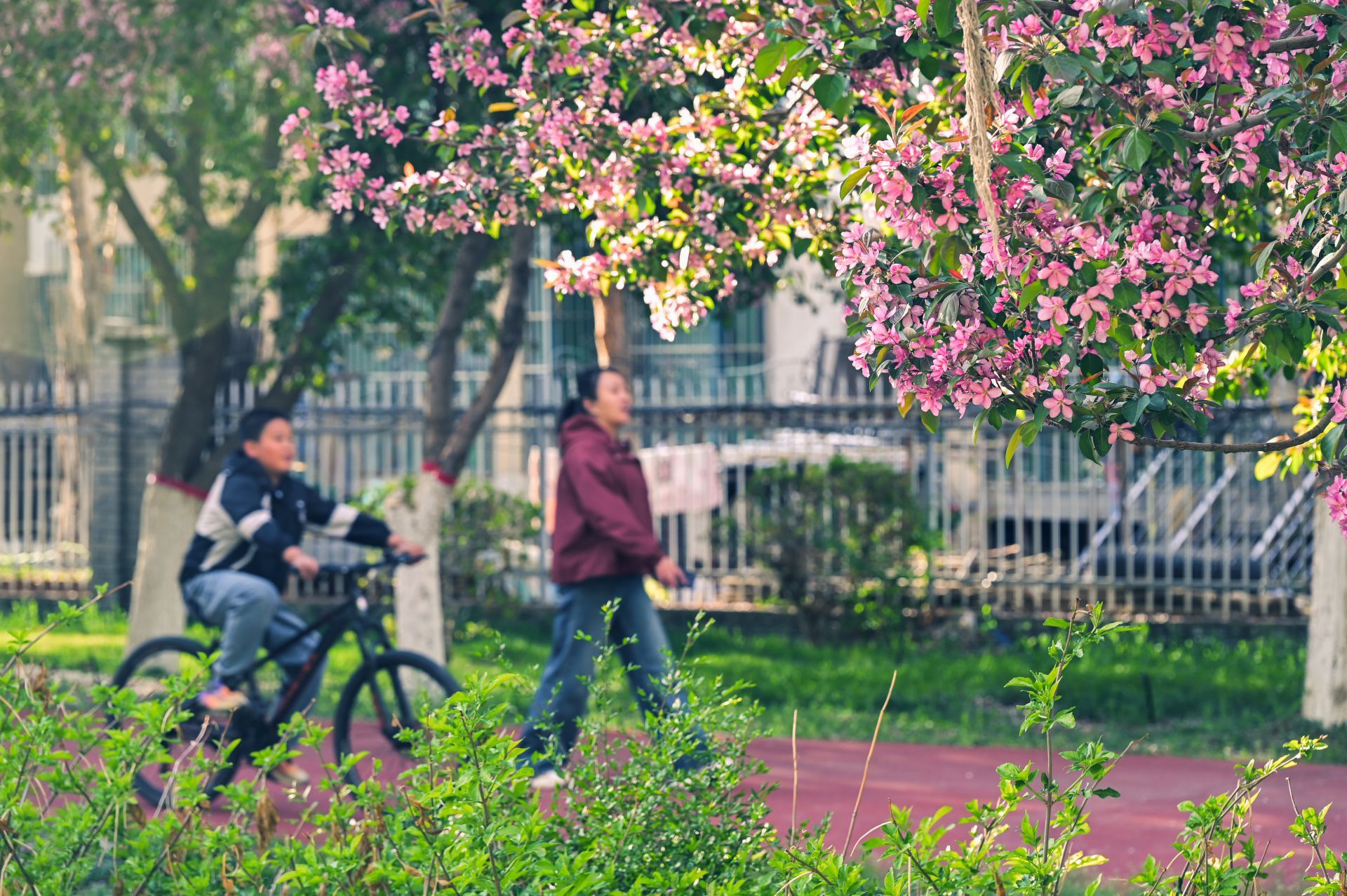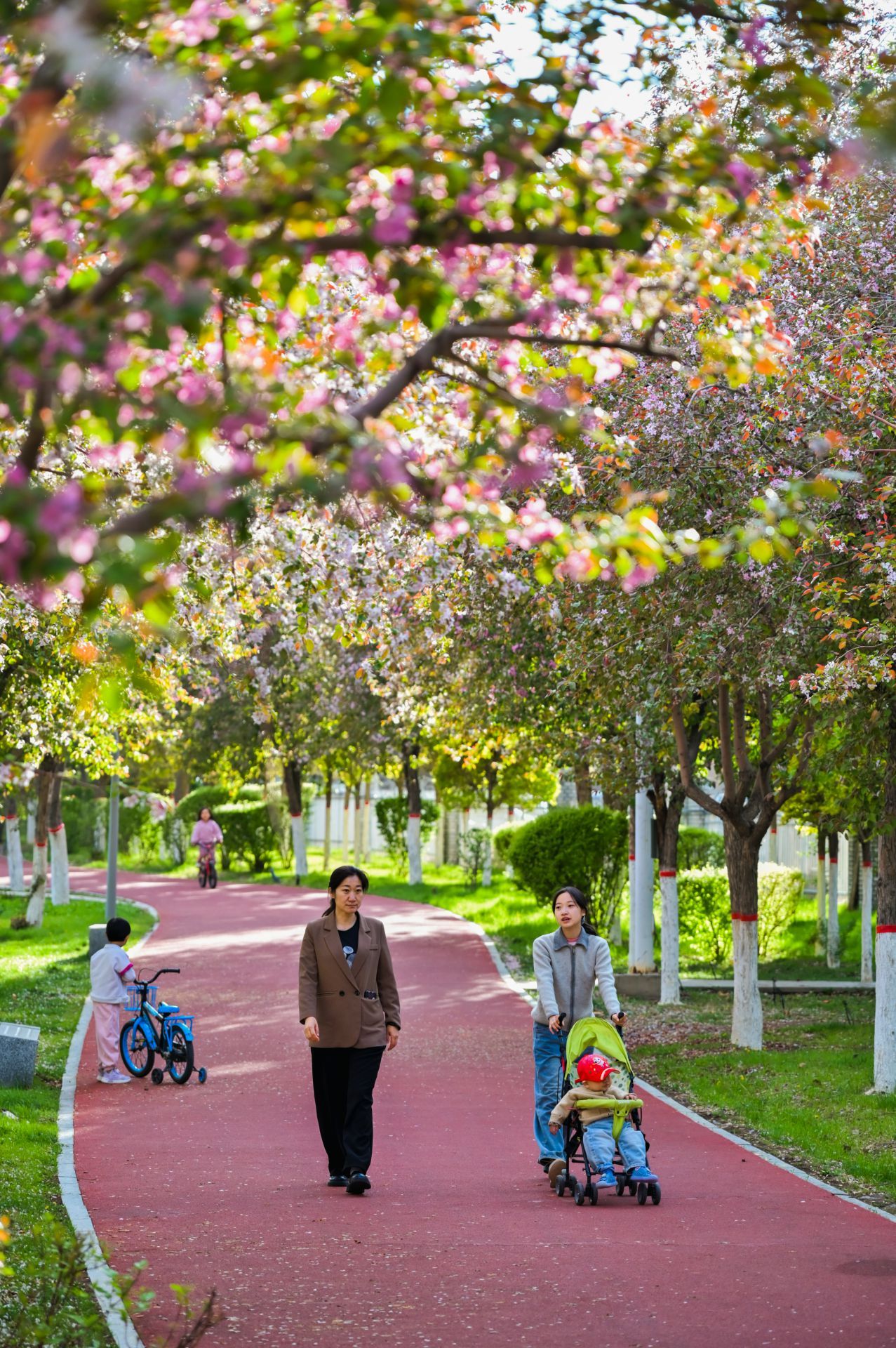 4月下旬,新疆呼图壁县海棠路上景色怡人,宛如生态画廊。海棠花竞相绽放,粉白花海点缀着城市烟火。市民漫步在彩色步道上,赏花拍照,孩子们在花荫下嬉戏,一派生活和美的温馨景象。