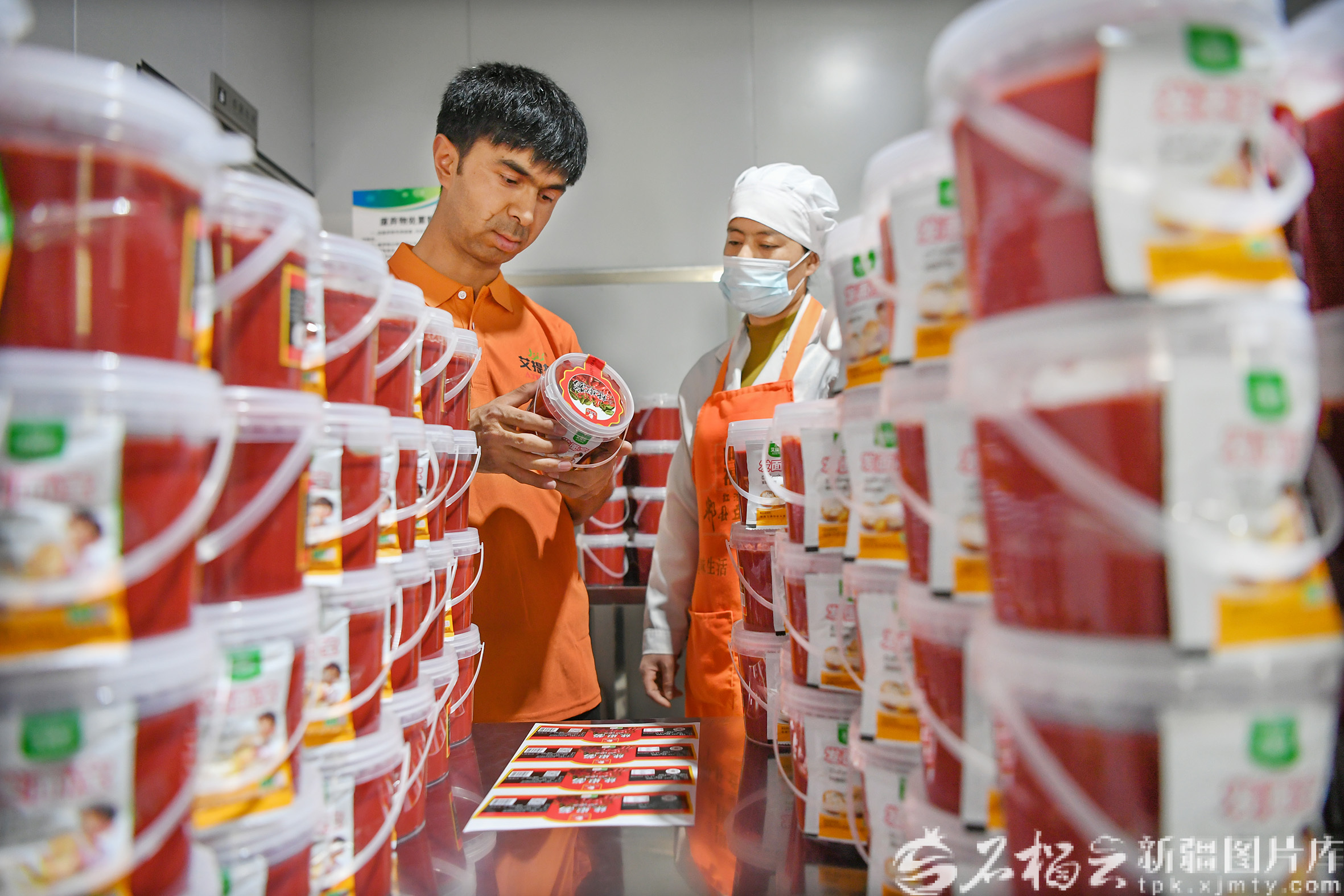 4月27日,努尔买买提・则亚吾东(左)与员工查验调料品质。