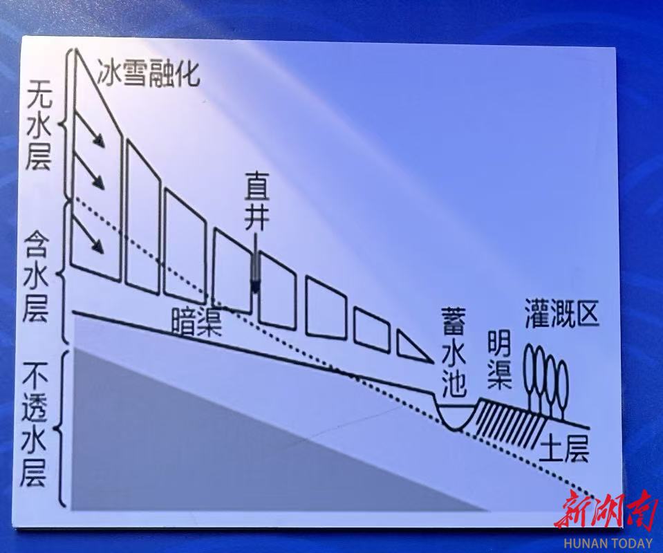 吐鲁番盆地北倚博格达山,西靠喀拉乌成山,夏季融雪渗入戈壁,汇成潜流,为坎儿井提供丰沛水源。当地干旱酷热,蒸发量大,而坎儿井通过地下暗渠输水,不受季节风沙影响。百姓在雪水潜流处寻源,每隔一段距离开凿深浅不等的竖井,然后依地势高低在井底连通暗渠,暗渠出水口则与地面渠道连接,灌溉良田,滋润万物。