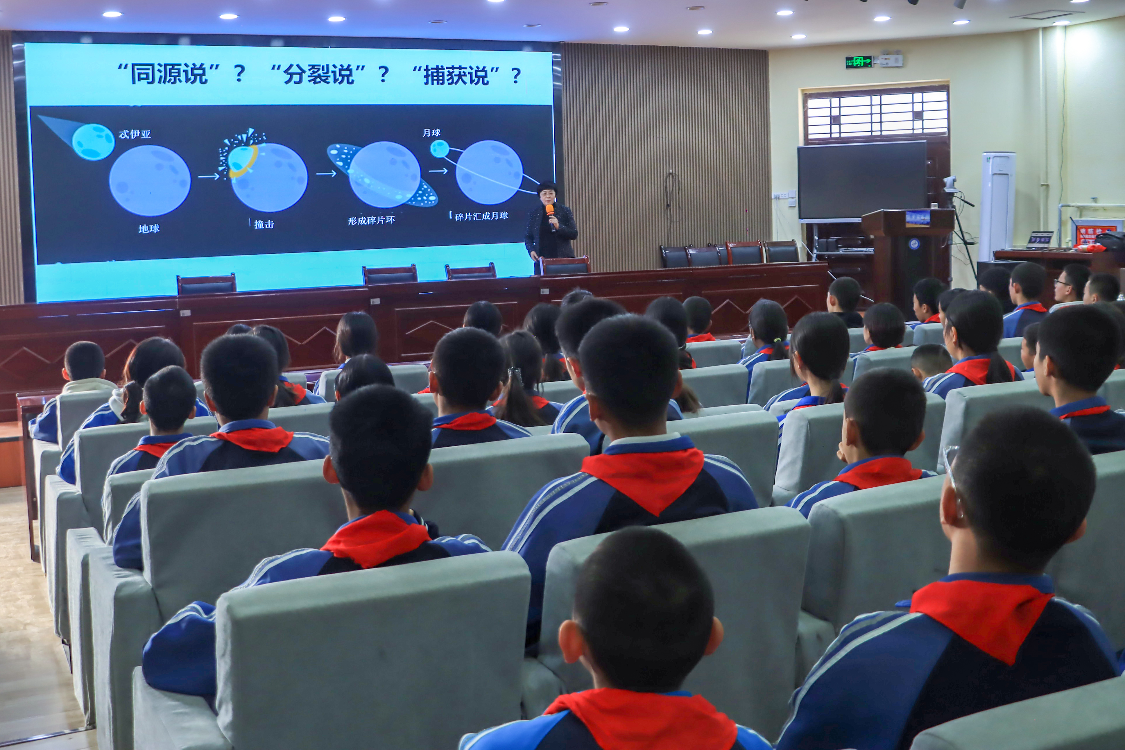在科普讲座环节,北京科技记者编辑协会副理事长周武以《蟾宫取宝:嫦娥奔月的故事》为主题,带领同学们探索月球奥秘,回顾中国“嫦娥工程”发展历程,展望未来载人登月与月球科研站建设蓝图。通过精彩的图片和视频资料,展示了中国探月工程取得的科技成就,阐释了其中蕴含的科技创新成果,并重点解读了“追逐梦想、勇于探索、协同攻坚、合作共赢”的探月精神。