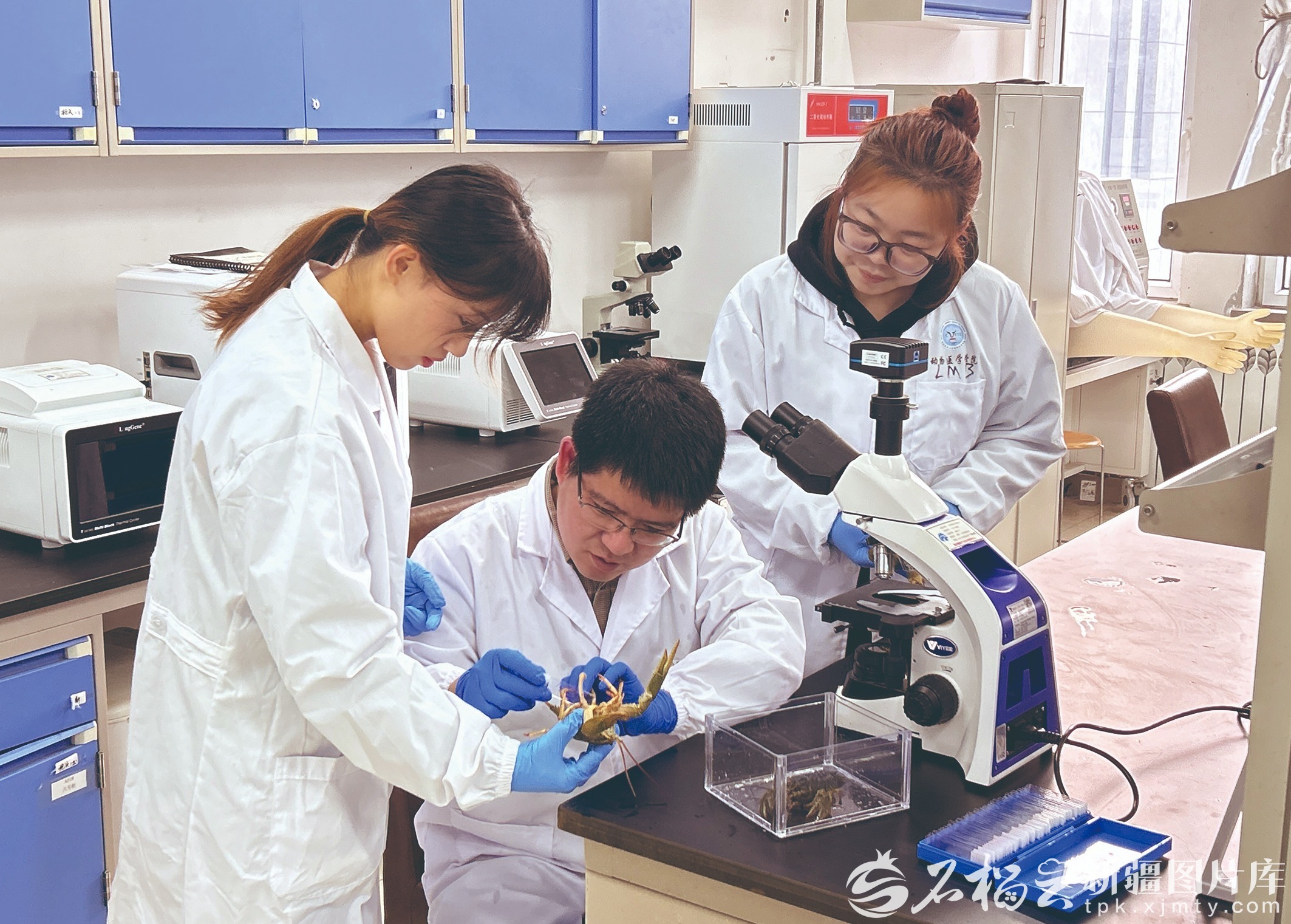 1月29日,在新疆农业大学动物医学学院实验室,新疆吉木乃窄螯螯虾科技小院师生正在观察螯虾性腺组织切片。张格 摄