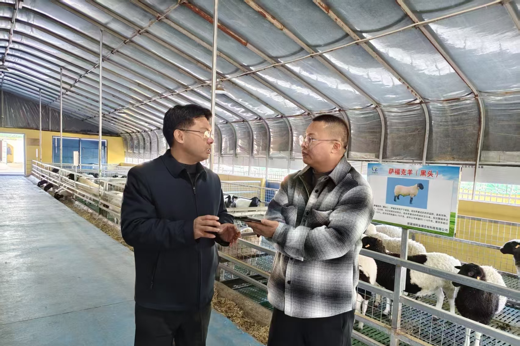 2月6日,在柯坪县新疆湖柯金澜农牧科技有限公司养殖场,石榴云/新疆日报记者陈疆林(右)采访浙江农林大学动物营养研究所所长王翀。荆云辉 摄