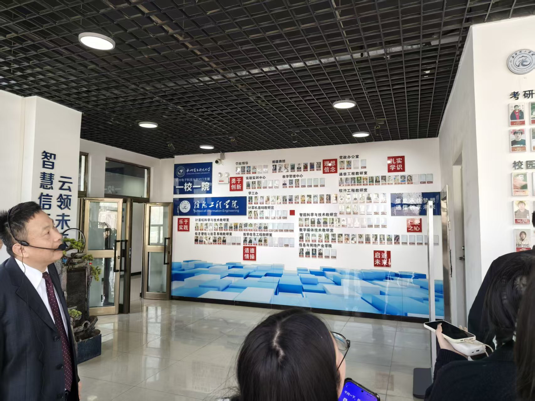 中国地质大学援疆干部、新疆理工学院信息工程学院院长李振华(左一)向媒体介绍学院情况。石榴云/新疆日报记者 张治立摄
