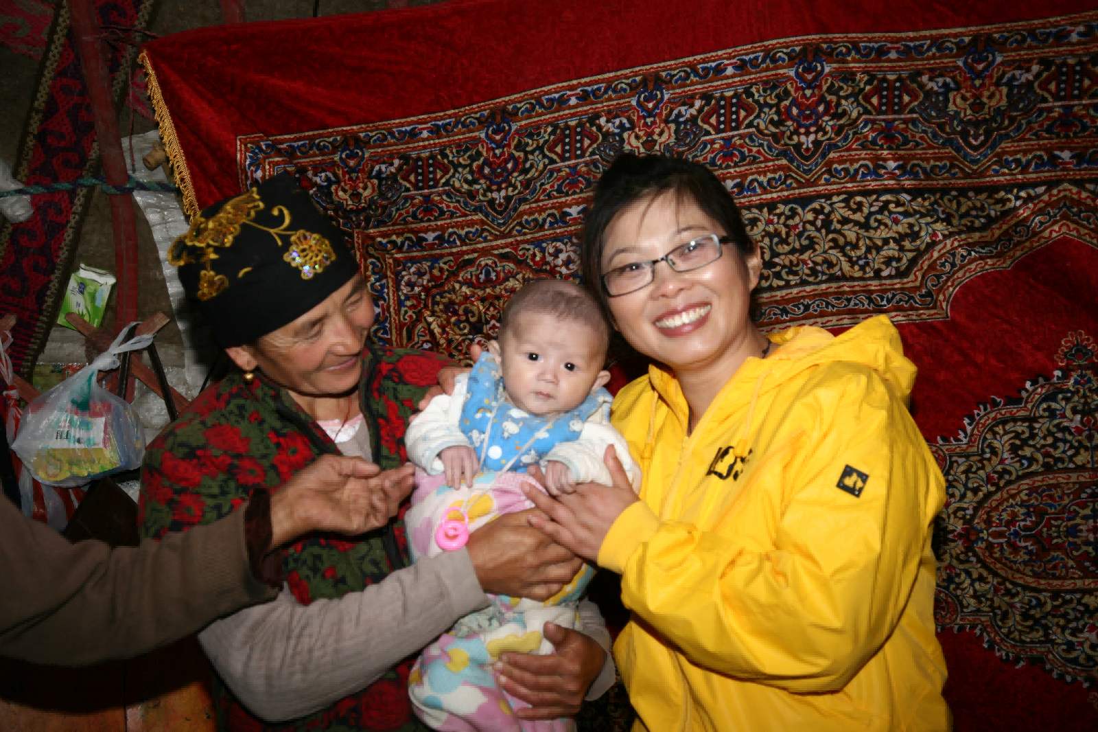 2011年7月,叶热加那提·托乎塔(中)出生3个月时,伊宁县人民医院妇产科医生成晓燕(右)前往孩子家中探望。成晓燕供图