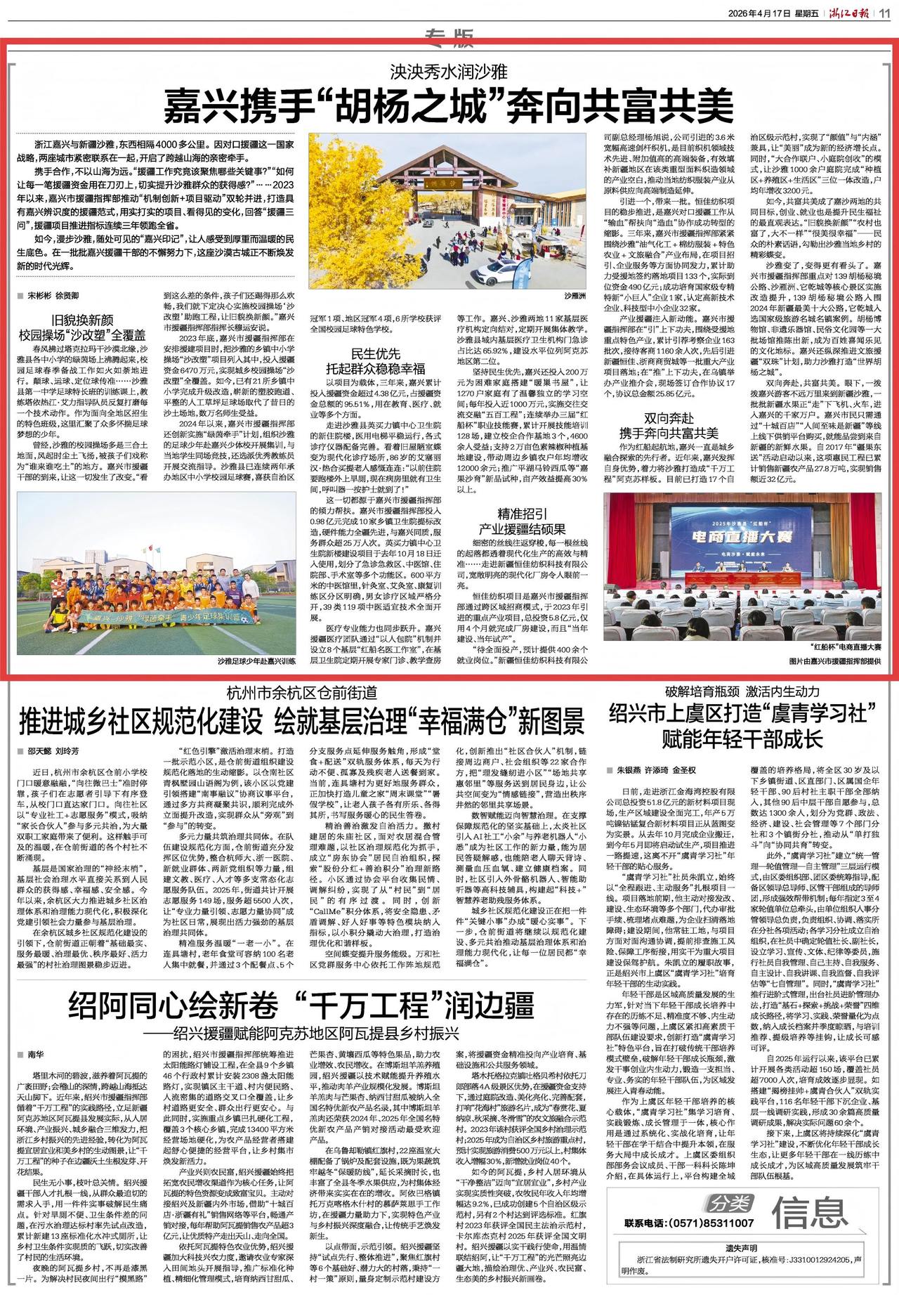 4月17日,《浙江日报》刊发《泱泱秀水润沙雅 嘉兴携手“胡杨之城”奔向共富共美》一文,全文如下: