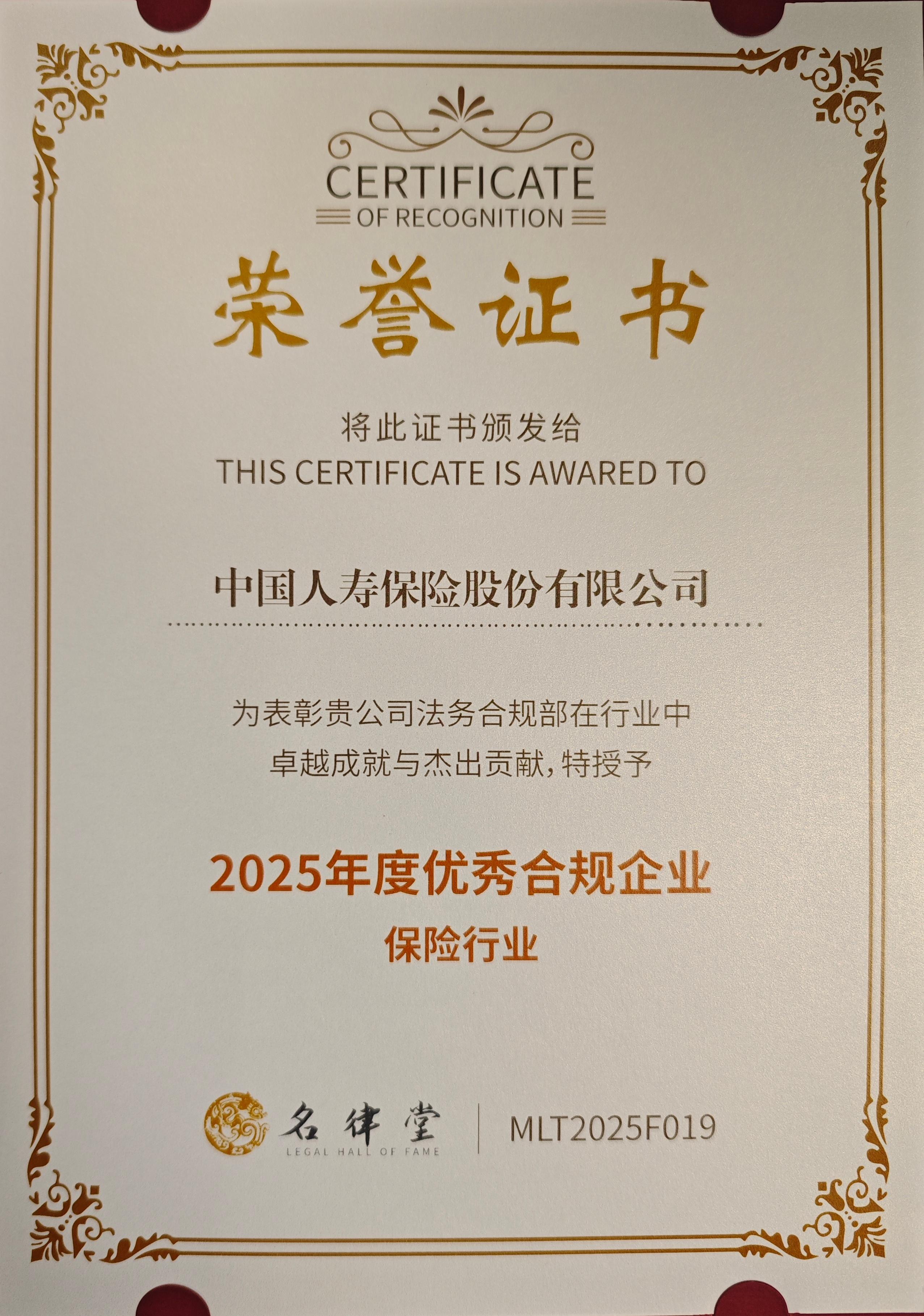 近日,在国内法律行业交流平台名律堂组织的“2025年企业合规先锋榜”评选项目中,中国人寿保险股份有限公司(以下简称“中国人寿”,股票代码:601628.SH,2628.HK)荣膺保险行业“2025年度优秀合规企业”。
